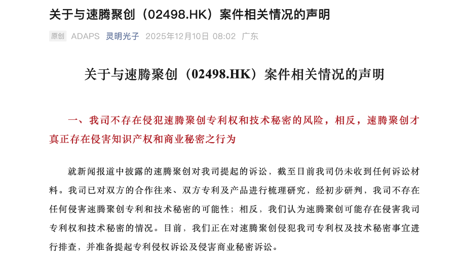 激光雷达芯片“疑云”:灵明光子称“不存在对速腾聚创侵权风险”