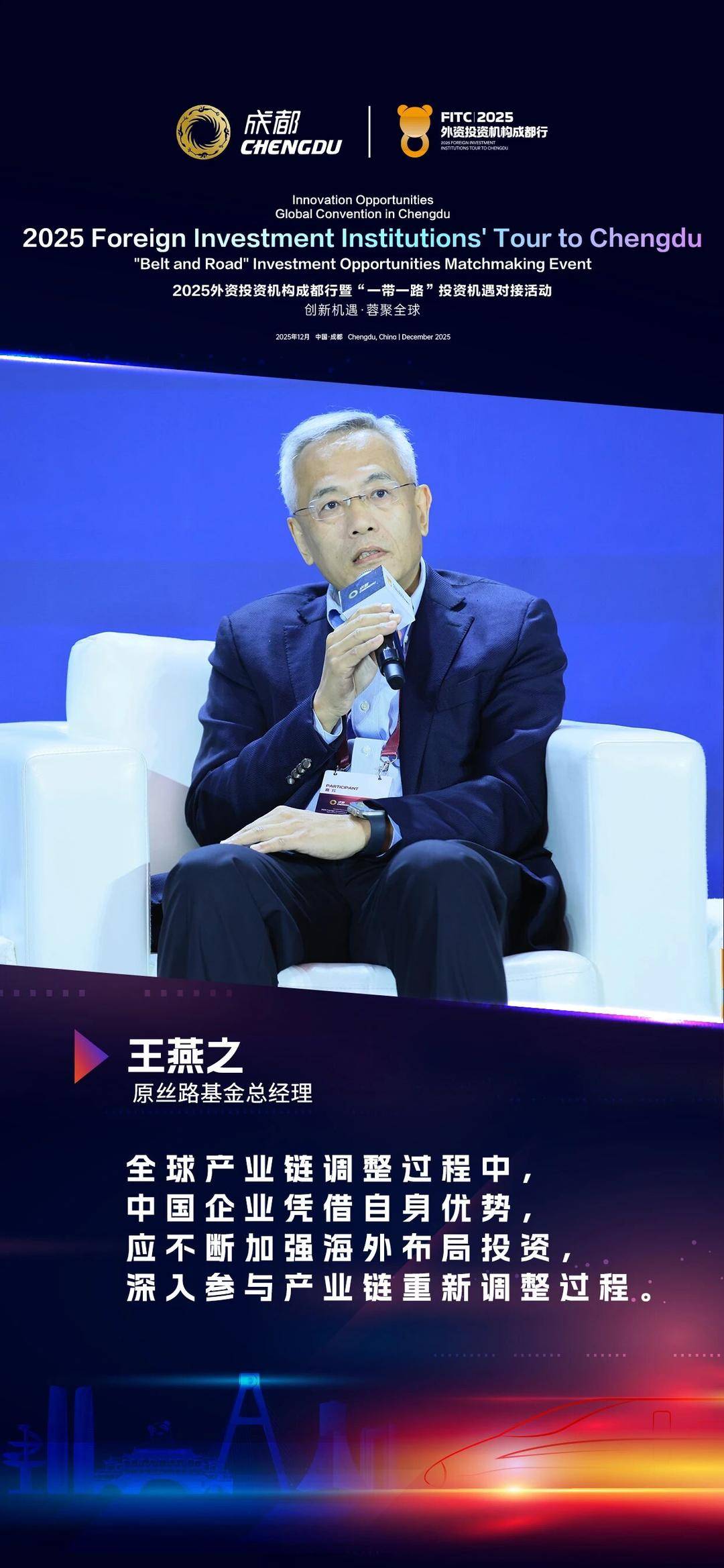 封面新闻记者 杨鑫 设计 胡雅兰 12月9日上午,在成都市委金融办、成都市委外事办联合主办的2025外资投资机构成都行启动仪式暨"一带一路"投资机遇对接活动上,10余位知名投资机 构嘉宾开展圆桌交流。从中国资本市场变革与外资新机遇,到全球基金投资布局与未来产业赛道,再到成都对外开放与未来投资潜力,议题层层深入,嘉 宾回答鞭辟入里,值得关注。 H : R.Z 原丝路基金总经理 全球 产业 链调 整 过程中 中国企业凭借自身优势, 应 不 断 加 强 海 外 布 后 投 资 深入参与产业链重新调整过程 市| 市场| 高安家| Innovation Opportunities Global Convention in Chengdu 2025 Foreign Investment Institutions' Tour to Chengdu "Belt and Road" Investment Opportunities Matchmaking Event 2025外资投资机构成都行暨"一带一路"投资机遇对接活动 创新机遇 · 蓉聚全球 2025年12月 中国·成都 Chengdu, China | December ...
