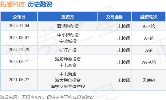 数据来源:天眼查APP 浙江拓感科技有限公司成立于2021-06-28,公司法人代表为李建林,注册地址为浙江省嘉兴市海宁市海 昌街道谷水路306号A18二层,注册资本为1000万人民币,公司主要经营一般项目:技术服务、技术开 发、技术咨询、技术交流、技术转让、技术推广;电子元器件制造;集成电路芯片及产品制造。许可项 目:技术进出口;货物进出口。 | 公布日 | 投资方 | 交易金额 | 融资轮次 | | --- | --- | --- | --- | | 2025-11-04 | 西湖科创投 | 未披露 | A++轮 | | 2025-08-07 | 中小担创投 | 未披露 | A+轮 | | | 宁波城投 | | | | 2024-12-29 | 浙江产投 | 未披露 | A轮 | | 2023-06-11 | 浙股坤鑫投资 | 未披露 | Pre-A轮 | | | 中申真金 | | | | 2021-06-27 | 世史出任 浙大联创投资 | 未披露 | 天使轮 | | | 海宁泛半导体产投 | | | 证券之星消息,根据天眼查APP于11月4日公布的信息整理,浙江拓感科技有限公司A++轮融资,融资 额未 ...