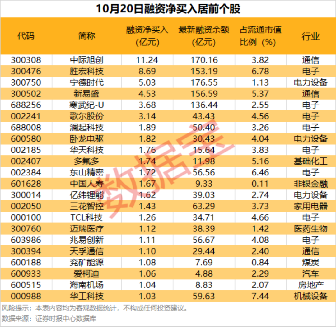 市场主要指数今日(10月21日)集体高开,近3000只股开盘上涨。 盘面上,工程机械板块大幅拉升,山河智能、建设机械涨停,铁建重工、志高机械等跟涨。 保险股延续强势,中国人寿涨超3%,中国太保涨超2%;多元金融走强,鲁信创投、瑞达期货涨停。 油气开采及服务板块延续大涨,通源石油、潜能恒信涨超6%。 培育钻石概念爆发,惠丰钻石、四方达、英诺激光涨超10%,黄河旋风涨停。存储芯片概念大涨,大为股份涨停,雅创电子(维权)、云汉芯城涨超 10%。CPO概念继续强势,汇绿生态收获两连板,中富电路、源杰科技、斯瑞新材等跟涨。 22股杠杆资金加仓超1亿元 截至10月20日,市场融资余额合计2.41万亿元,较前一交易日增加3.96亿元。 社保基金三季度重仓股: 新进4股,增持5股 财报季,社保基金持股动向曝光!社保基金最新出现在18只个股前十大流通股东名单中,合计持股量1.9亿股,期末持股市值合计70.45亿元。持股变动显 示,新进4只,增持5只,不变2只,减持7只。 具体到个股,10月20日获融资净买入千万元以上的有386只,其中22只融资净买入额超1亿元。中际旭创融资净买入额居首,当日净买入11.24亿元;其次 是胜宏科 ...