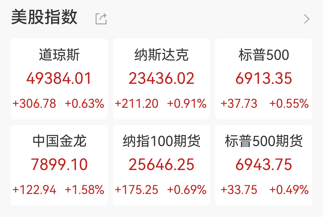 1月23日,美股三大指数收盘集体上涨,道指涨0.63%,纳指涨0.91%,标普500指数涨0.55%。 美国当天公布的一系列宏观数据整体偏强。地缘政治担忧消散,叠加美国经济数据强劲,提振风险偏好。美股主要股指连续第二个交易日上涨,完全收复 本周早些时候的失地。降息预期减弱下,短期美债承压。2年期美债收益率上行2.5个基点,10年期收益率则持平于昨日尾盘。美元下挫0.5%,逼近98关 口。 美股大型科技股普涨,万得美国科技七巨头指数上涨1.47%。个股方面,微软、亚马逊涨超1%,Meta收涨5.7%,创7月31日以来最大单日涨幅;甲骨文涨 超2%,AMD涨超1%。 特斯拉涨超4%,据智通财经,全球首富、特斯拉CEO埃隆·马斯克最新表示,特斯拉可能会在明年年底前开始向公众销售其人形机器人"Optimus"(擎天 柱)。当地时间周四(1月22日),马斯克在瑞士达沃斯举行的世界经济论坛年会上发表演讲时表示,特斯拉已经在工厂中使用部分擎天柱执行一些简单 任务。 英特尔盘后大跌近10%,报49.14美元。英特尔第四季度营收136.7亿美元,同比减少4.1%,市场预估134.3亿美元;第四季度调整后每股收益0.15美元,上 ...