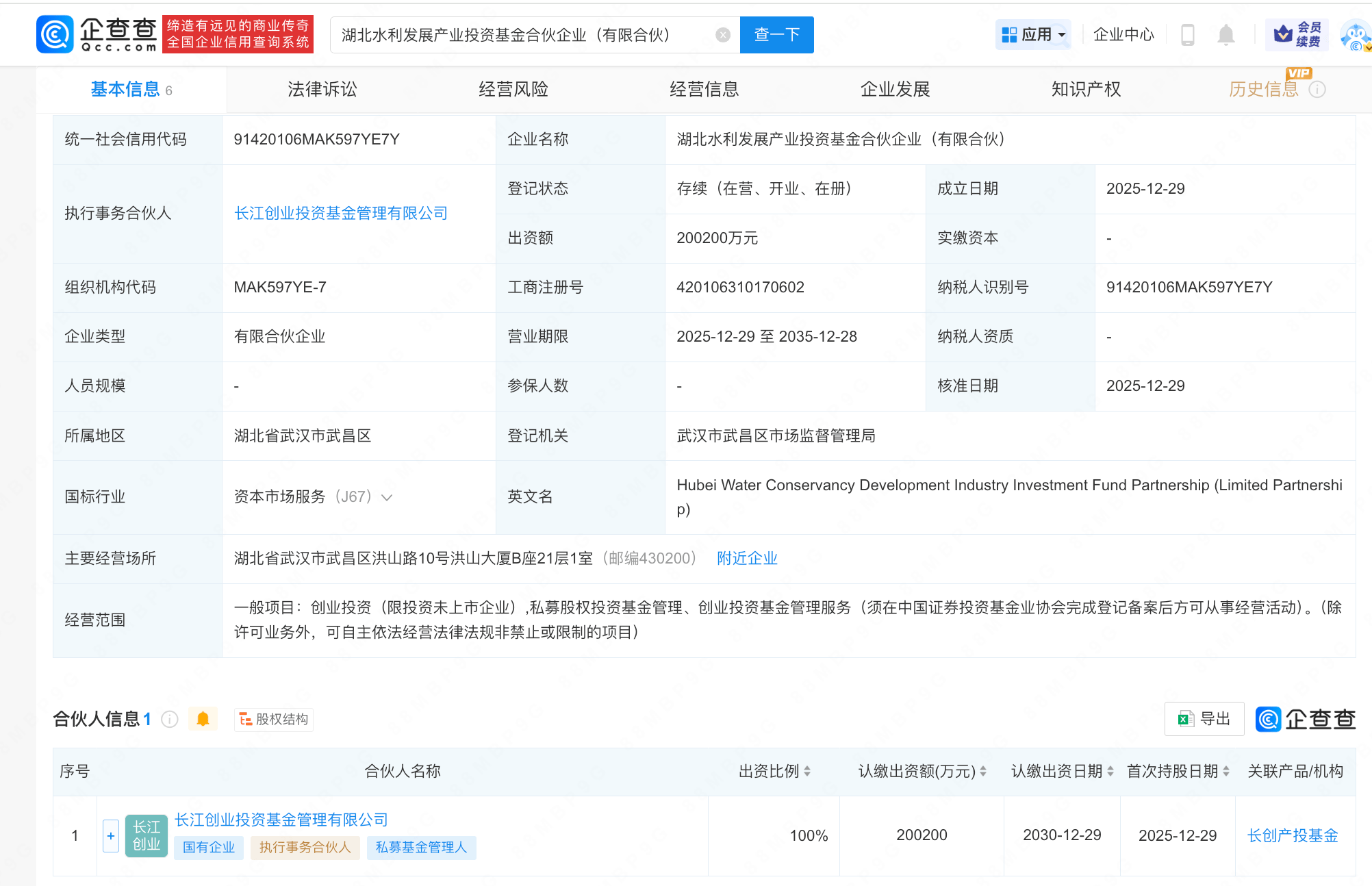 | 基本信息 6 | 法律诉讼 | 经营风险 | 经营信息 | | --- | --- | --- | --- | | 统一社会信用代码 | 91420106MAK597YE7Y | 企业名称 | 湖北水利发 | | 执行事务合伙人 | 长江创业投资基金管理有限公司 | 登记状态 | 存续(在营 | | | | 出资额 | 200200万テ | | 组织机构代码 | MAK597YE-7 | 工商注册号 | 42010631C | | 企业类型 | 有限合伙企业 | 营业期限 | 2025-12-29 | | 人员规模 | - | 参保人数 | - | | 所属地区 | 湖北省武汉市武昌区 | 登记机关 | 武汉市武昌 | | 国标行业 | 资本市场服务 (J67) v | 英文名 | Hubei Wate | | | | | p) | | 主要经营场所 | 湖北省武汉市武昌区洪山路10号洪山大厦B座21层1室(邮编430200) 附近: | | | | 经营范围 | 一般项目:创业投资(限投资未上市企业),私募股权投资基金管理、创业投资 | | | | | 许可业务外,可自主依法经营法律法规非禁止或限制的项 ...