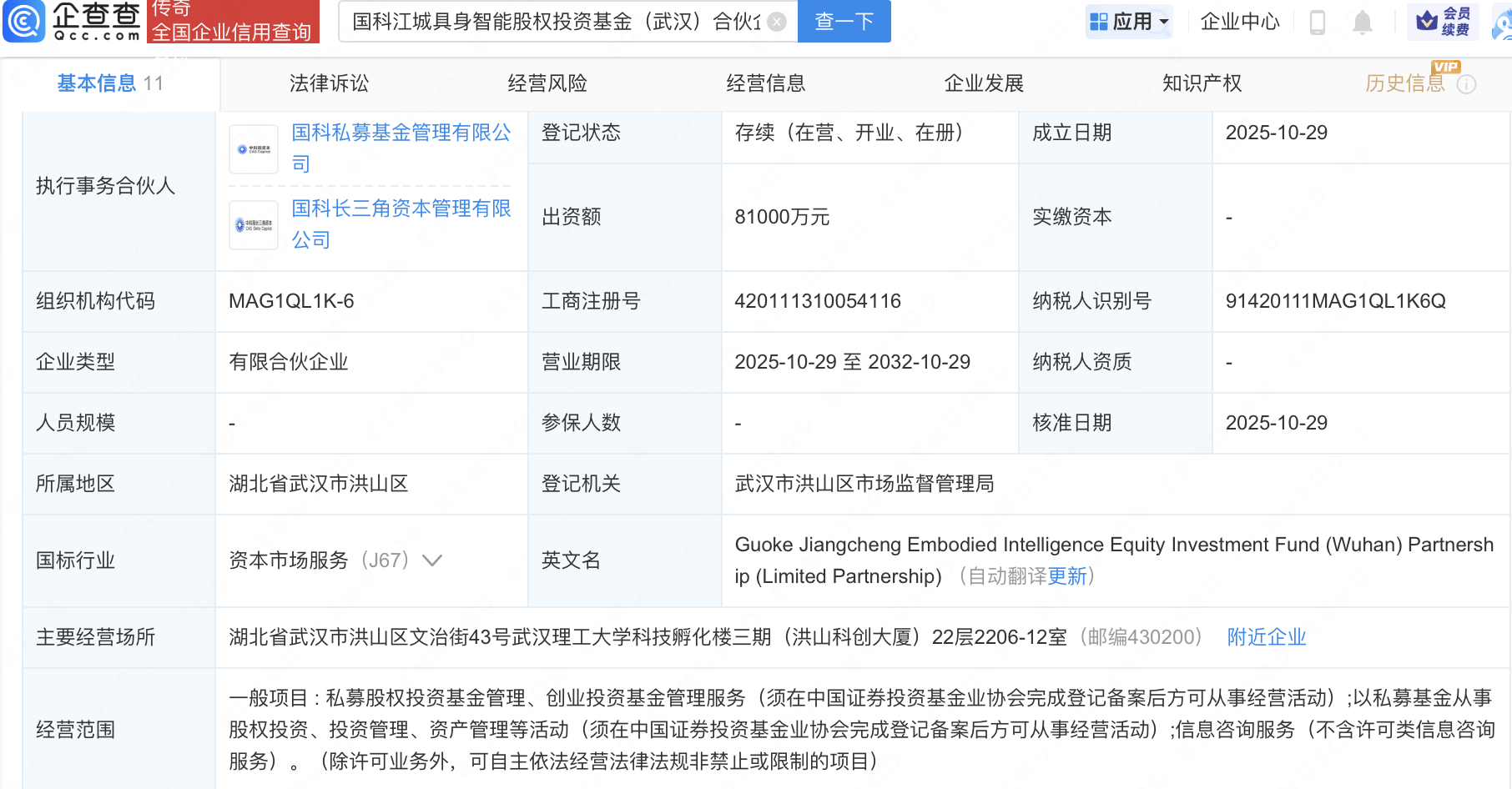 | 全国企业信用查询 | | 国科江城具身智能股权投资基金(武汉)合伙1 ○ | 查一下 | | --- | --- | --- | --- | | 基本信息 11 | 法律诉讼 经营风险 | | 经营信息 | | 执行事务合伙人 | 国科私募基金管理有限公 По 国科长三角资本管理有限 | 登记状态 出资额 | 存续(在营、开业、 81000万元 | | | 公司 | | | | 组织机构代码 | MAG1QL1K-6 | 工商注册号 | 420111310054116 | | 企业类型 | 有限合伙企业 | 营业期限 | 2025-10-29 至 2032 | | 人员规模 - | | 参保人数 | l | | 所属地区 | 湖北省武汉市洪山区 | 登记机关 | 武汉市洪山区市场监 | | 国标行业 | 资本市场服务 (J67) ∨ | 英文名 | Guoke Jiangcheng E ip (Limited Partnersh | | 主要经营场所 | 湖北省武汉市洪山区文治街43号武汉理工大学科技孵化楼三期(洪山科创大厦 | | | | 经营范围 | 一般项目:私募股权投资基金管理、创业投资基金管理服 ...
