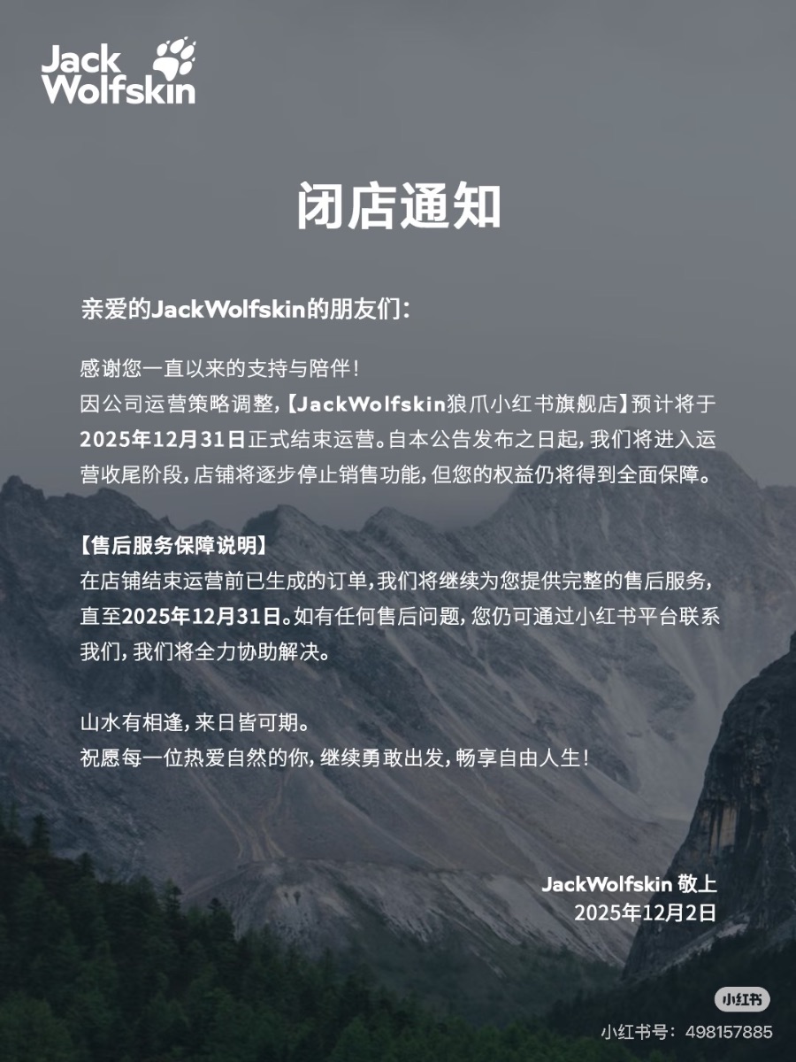 记者丨贺泓源 编辑丨高梦阳 安踏集团对于Jack Wolfskin(狼爪)的改造正在拉开帷幕。 2025年12月2日,狼爪发布闭店通知,宣布因公司运营策略调整, 其小红书旗舰店预计于2025年12月31日正式结束运 营。"自本公告发布之日起,我们将进入运营收尾阶段,店铺将逐步停止销售功能,但您的权益仍将得到全面保障。" 狼爪在公告中称。 据界面新闻报道称,狼爪小红书店铺之前由合作经销商代运营,由于品牌运营策略调整,与目前代运营公司到年底会 结束合作,因此需要闭店重新调整。 对于狼爪关闭小红书旗舰店一事, 安踏集团向21世纪经济报道记者的回应是,以前述闭店通知为准。 4月10日,安踏集团宣布,以全资收购起源于德国的户外服饰、鞋履及装备专业品牌狼爪,基础对价为现金2.9亿美 元。 6月18日,安踏集团宣布,姚剑成为狼爪品牌掌舵人。 姚剑是安踏的"大功臣",正是他开启了始祖鸟在华狂奔。 2019年3月,安踏集团联合财团完成对始祖鸟母公司亚玛芬体育收购的几个月后,姚剑入职亚玛芬,担任大中华区总经 理。2024年,姚剑晋升为亚玛芬大中华区总裁,全面负责始祖鸟和威尔胜等品牌的中国业务。同年,姚剑担任亚玛芬 大中华区总裁期 ...