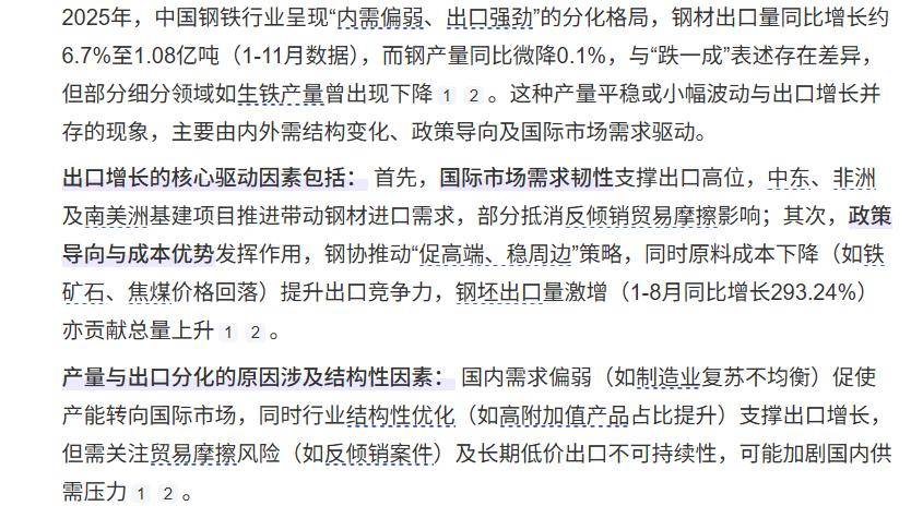 这篇文章分析钢铁的国内产量下滑与出口激增背后的全球变局,最近钢铁行业的数据,让很多人直呼看不懂,一边是国内的炉子明显凉了,另一边却是运往 海外的货轮更忙了,这种"冰火两重天"的景象,恰恰成了观察当前中国经济结构转型与全球贸易格局变化的一个独特体现。 数据背后的"冷"与"热":产量锐减与出口飙升的悖论 国家统计局的数据清晰地显示,11月全国的粗钢产量,和去年同月相比,下降了10.9%,这个跌幅可不小,是近年来少见的大幅下滑,钢厂的生产积极性, 看起来确实不高。 但海关总署发布的另一组数字,却描绘了另一幅图景,同样是11月,中国出口的钢材总量达到了806万吨,比去年同期增长了8.4%,要知道,这是连续第7 个月实现同比增长,一边是产量"跳水",一边是出口"爬坡",这个剪刀差越来越明显。 国际投行摩根士丹利在近期的一份报告里,点破了这层窗户纸,报告的核心观点是,国内的需求是真的跟不上了。 过去那些"吃钢嚼铁"的大户——房地产和基础设施建设,它们的热度降下来了,根据行业分析,建筑领域占了中国钢铁消费的一半以上。 这块需求收缩,多出来的产能就像水满了要溢出一样,必然要寻找新的去处,而海外市场,就成了一个最直接的"泄洪区 ...