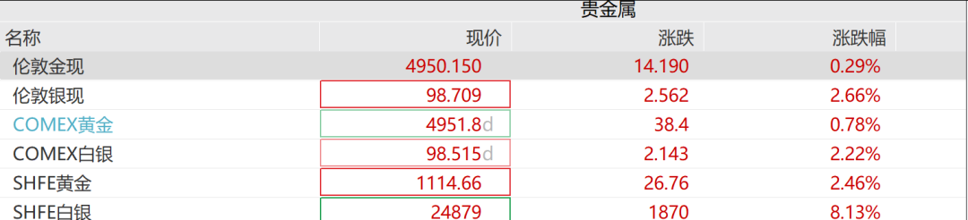 记者丨李益文 1月23日,国际黄金市场迎来大幅上涨,现货黄金一举站上4950美元/盎司关口,刷新历史最高纪录,最高触及4967.37美元/盎司。COMEX黄金期货价格同 步走强,最高触及4970美元/盎司,距离5000美元整数关口仅一步之遥。 | | 贵金属 | | | | --- | --- | --- | --- | | 名称 | 现价 | 涨跌 | 涨跌幅 | | 伦敦金现 | 4950.150 | 14.190 | 0.29% | | 伦敦银现 | 98.709 | 2.562 | 2.66% | | COMEX黄金 | 4951.8d | 38.4 | 0.78% | | COMEX自银 | 98.515d | 2.143 | 2.22% | | SHFE黄金 | 1114.66 | 26.76 | 2.46% | | SHFE自银 | 24879 | 1870 | 8.13% | 事实上,当前全球央行正在掀起新一轮购金热潮。中国人民银行官方储备资产数据显示,截至2025年12月末,我国黄金储备为7415万盎司,当月增持3万 盎司。值得注意的是,这已是央行自2024年11月以来,连续第14个月增持黄 ...
