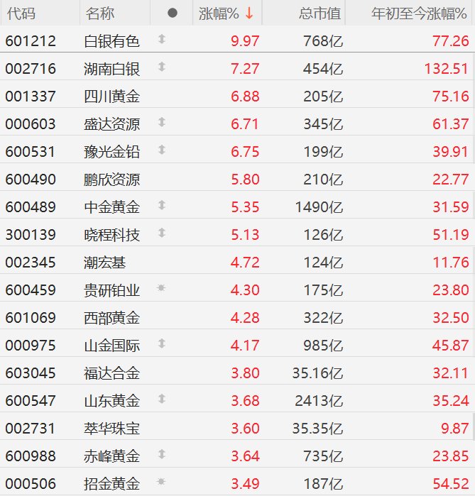 股票频道更多独家策划、专家专栏,免费查阅>> | 代码 | 名称 | | 涨幅% ↓ | 总市值 | 年初至今涨幅%。 | | --- | --- | --- | --- | --- | --- | | 601212 | 白银有色 | 1 | 9.97 | 768亿 | 77.26 | | 002716 | 湖南日银 | 1 | 7.27 | 454亿 | 132.51 | | 001337 | 四川黄金 | | 6.88 | 205亿 | 75.16 | | 000603 | 盛达资源 | 1 | 6.71 | 345 Z | 61.37 | | 600531 | 豫米金铝 | 1 | 6.75 | 199亿 | 39.91 | | 600490 | 鹏欣资源 | | 5.80 | 210亿 | 22.77 | | 600489 | 中金黄金 | 1 | 5.35 | 1490 乙 | 31.59 | | 300139 | 晓程科技 | 1 | 5.13 | 126亿 | 51.19 | | 002345 | 潮宏基 | | 4.72 | 124亿 | 11.76 | | 600459 | 贵研铂业 | 一 ...