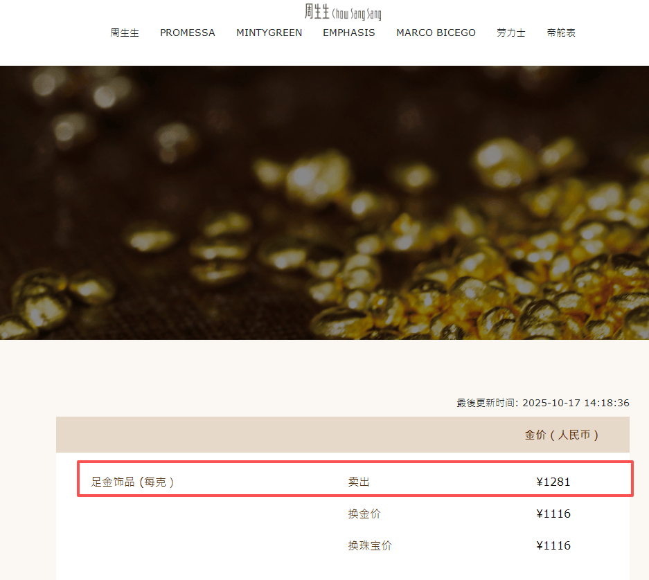 本报记者 贺王娟 不过,国投安信期货提示,金银冲向此轮价格顶峰的进程远未结束,也不会一蹴而就,其短期上涨斜率过高,日度周度月 度级别均呈现显著的超买信号。当前做多贵金属交易拥挤,双向波动已经开始放大。 | 周大福 | 周六福 | 周生生 周生生 | | --- | --- | --- | | 1279.00 | 1190.00 | 1281.00 | | 金条价格 1269.00 | 金条价格 1085.00 | 1139.0( 金条价格 | | 周大堂 周大生 | 册 潮宏基 | 六福珠宝 | | 1279.00 | 1279.00 | 1279.00 | | 铂金价格 687.00 | 铂金价格 687.00 | 金条价格 1269.0( | | 秒 老凤祥 | 命 老庙黄金 | 生 中国百合 | | 1280.00 | 1279.00 | 982.50 | | 足金价格 1280.00 | 金条价格 1235.00 | 零售价 998.50 | 记者注意到,在金价上涨加速阶段,多个金饰品牌"一口价"黄金调价的节奏正在加快,如周生生门店工作人员对《证券日 报》记者表示,日前,店铺内多个"一口价"金饰产品已 ...