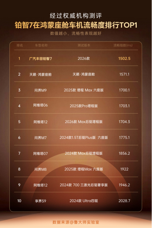 在鲁大师近日公布的车机系统流畅度排行榜中,丰田铂智7杀进前十,不仅成为前十中唯一的合资车 型,并在鸿蒙车型中排名第一。在智能化竞争白热化的当下,一款20万级合资轿车,为何能在鸿蒙体系 中跑出第一的流畅度? 据了解,铂智7定位于20-30万级主流纯电轿车区间。在这一价位内,一次性集齐鸿蒙座舱5.0、预瞄双 腔空悬、华为电驱平台、符合NASA标准的零重力座椅等配置,并不多见。丰田的策略,并非在铂智7 上简单"堆料",而是以越级硬件建立价值锚点,把高端旗舰技术带入更广泛家庭用户的可承受区间。 值得关注的是,铂智7在产品定位上并不满足于"智能突出",而是通过系统化配置,与百万级旗舰形成 对标。以尊界S800为例,两者在多项核心维度上呈现高度相似的技术路径。 二者同为旗舰车型定位。铂智7车长超过5.1米,轴距达到3020mm,具备典型旗舰级车格。其次,双方 均搭载预瞄双腔空气悬架系统,通过路况预判实现提前滤震,在舒适与稳定之间取得平衡。动力系统方 面,铂智7采用华为DriveONE电驱平台,与尊界S800同源技术路线。 座椅舒适性同样成为对标重点。铂智7配备符合NASA标准夹角坐姿的零重力座椅,严格遵循脊柱与大 腿、大 ...