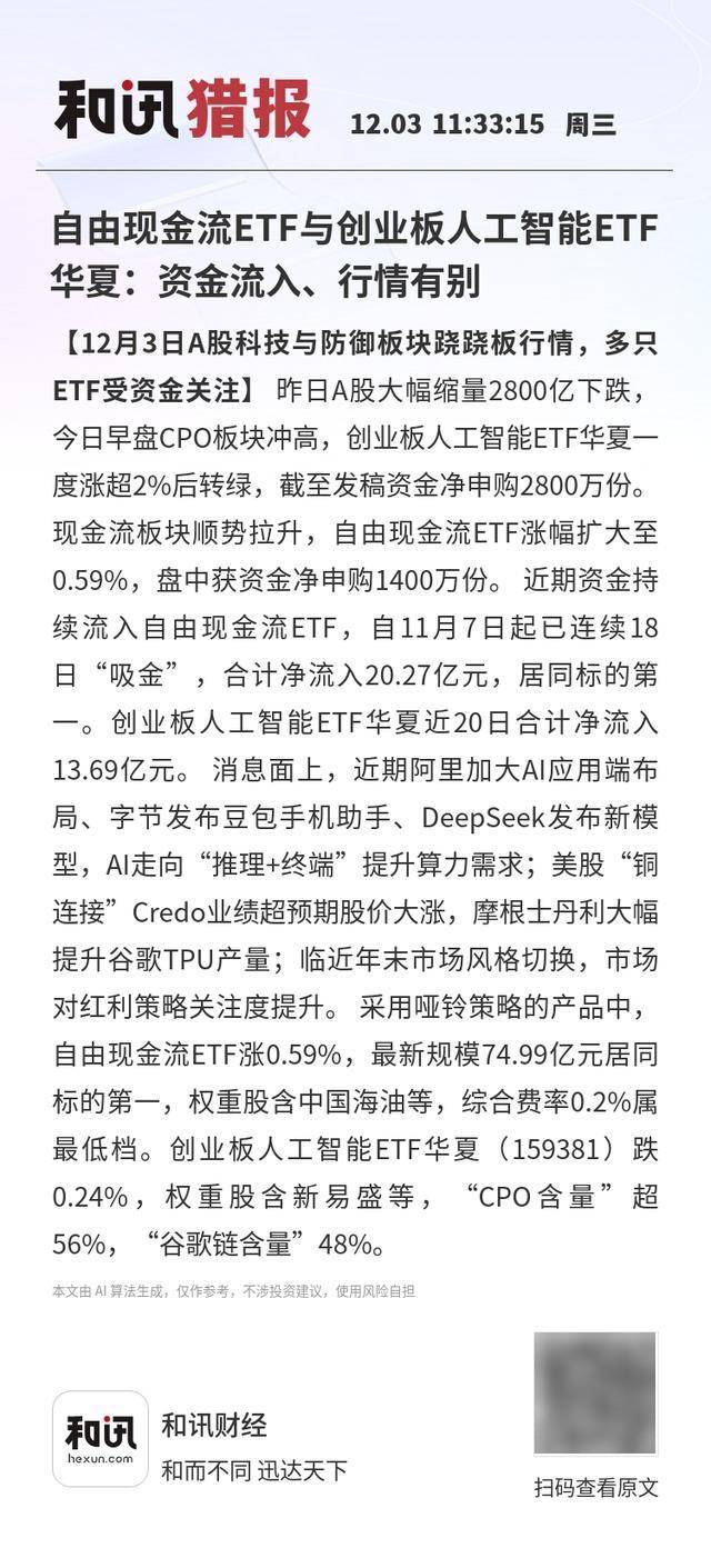 Group 1 - A-shares experienced a significant decline with a trading volume of 280 billion, while the CPO sector saw a brief surge in early trading [1] - The AI ETF from Huaxia on the ChiNext index rose over 2% before turning negative, with a net subscription of 28 million units as of the report [1] - The Free Cash Flow ETF expanded its gains to 0.59%, attracting a net inflow of 140 million units during the session, marking 18 consecutive days of inflows totaling 2.027 billion [1] Group 2 - Recent developments in AI, including Alibaba's increased focus on AI applications and ByteDance's launch of the Doubao mobile assistant, are driving demand for computational power [1] - The stock price of Credo surged after exceeding earnings expectations, prompting Morgan Stanley to significantly raise its production forecast for Google's TPU [1] - The market is shifting styles as year-end approaches, with increased attention on dividend strategies [1]