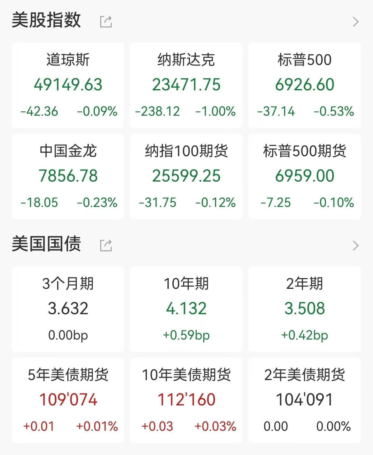 美东时间周三(1月14日),美国三大股指全线收跌,科技股成为拖累市场的主要因素。道琼斯工业指数微跌0.09%,报49149.63点;标普500指数下跌 0.53%,至6926.60点;纳斯达克指数跌幅居前,下挫1.00%,收于23471.75点。 | 道琼斯 | 纳斯达克 | 标普5( | | --- | --- | --- | | 49149.63 | 23471.75 | 6926. | | -42.36 -0.09% -238.12 -1.00% -37.14 - | | | | 中国余龙 | 纳指100期货 | 标普500 | | 7856.78 | 25599.25 | 6959.( | | -18.05 -0.23% -31.75 -0.12% --7.25 | | | | 美国国债 1 | | | | 3个月期 | 10年期 | 2年前 | | --- | --- | --- | | 3.632 | 4.132 | 3.501 | | 0.00bp | +0.59bp | +0.42b | | 5年美债期货 | 10年美债期货 | 2年美债! | | 109'074 | 112'160 | 10 ...