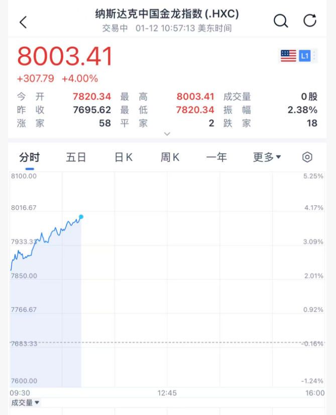 【导读】 中国资产,深夜大涨 中国基金报记者 泰勒 兄弟姐妹们啊,今晚继续关注海外市场的表现!好消息就是,中概股 大 涨了! 中国资产 大 涨 1月12日晚间,美股开盘之后,中概股指数涨幅扩大至4%,知乎涨近20%,阿里巴巴涨超10%! | 港股夜盘方面,恒生指数期货涨超1%,恒生科技指数期货涨近2%! | | --- | | 恒生指数期货 | 恒生科技指数期货 | | --- | --- | | · 26898.00 | · 5963.00 | | +301.00 +1.13% | +100.00 +1.71% | 美股震荡 再看回美股的情况,三大指数涨跌不一。 苹果在声明中写道:"经过审慎评估,我们认为谷歌的技术为Apple Foundation Models提供了最强大的基础,我们也对它将为 用户解锁的创新体验感到兴奋。" 此前有报道称,苹果正与谷歌进行初步谈判,拟使用一款定制的Gemini模型,为新版Siri提供驱动能力。 | 最高: 334.04 | 今开:325.80 | 成交量: 1262.16万股 | 换手:0.10% | | --- | --- | --- | --- | | 最低: 325 ...