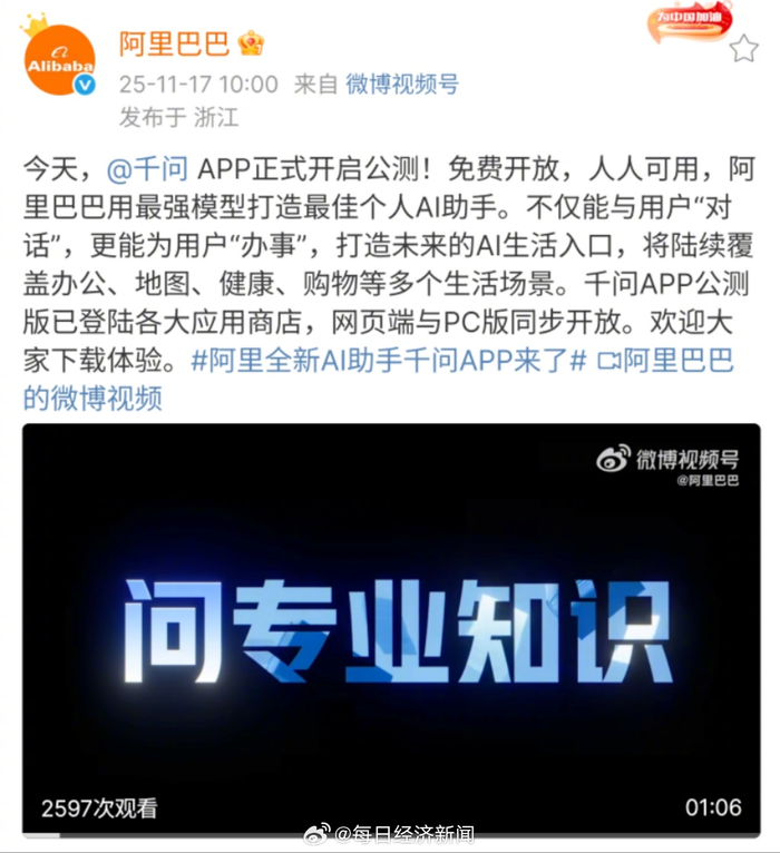 Core Viewpoint - Alibaba officially announced the launch of the "Qianwen" project, marking its strong entry into the AI to C market, with the Qianwen APP now in public beta, competing directly with ChatGPT [1] Group 1: Project Overview - The Qianwen APP is based on the globally top-performing open-source model Qwen3, offering free services and integrating with various life scenarios [1] - Alibaba's core management views the Qianwen project as a critical battle for the future in the AI era [1] Group 2: Strategic Integration - Alibaba plans to integrate the Qianwen APP with various life scenarios, including maps, food delivery, ticket booking, office work, learning, shopping, and health, enhancing its operational capabilities [1]