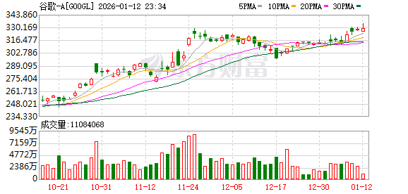 有报道称, 苹果公司选中谷歌的Gemini来运行今年即将推出的人工智能Siri系统。 报道发出后, 谷歌涨幅一度扩大至1%,再创历史新高 , 总市值重新突破4万亿美元。 | Us 谷歌-A | 17 Q | | --- | --- | | GOOGL | | | 220 700 今井 325.720 最高 334.040 最低 325.000 | | | 0.34% 1.130 换手 0.18% 息量 1074万股 金额 35.29亿 | | | 昨收 328.570 总值⊙ 3.98万亿 市盈™ 32.02 | 电子 | | 相关ETF 纳斯达克100ETF -0.20% | 市值占比 3.75% > | | 盘前 325.780 -2.790 -0.85% | 09:30 美东 √ | | ◀》年报预披露:于2026-02-03披露2025财年年报... ○× | | | 分时 五日 日K 周K 月K | 由名▼ | | 均价:328.704 最新:329.700 1.130 0.34% | | | 333.570 | 1.52% 卖1 329.730 115 | | 29 | 329.680 | | 分 ...