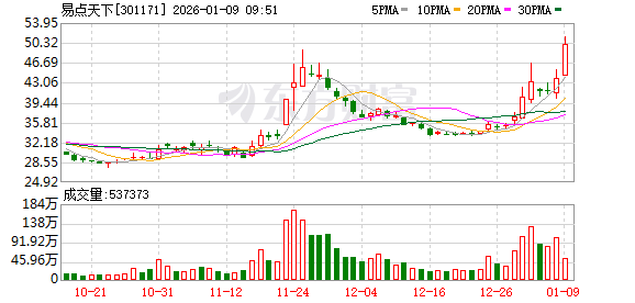 公司发布的三季报数据显示,前三季度公司共实现营业收入27.17亿元,同比增长54.94%,实现净利润 2.04亿元,同比增长4.41%,基本每股收益为0.4300元,加权平均净资产收益率5.57%。(数据宝) (文章来源:证券时报网) 两融数据显示,该股最新(1月8日)两融余额为14.40亿元,其中,融资余额为14.36亿元,近10日增加 4.94亿元,环比增长52.51%。 易点天下股价创出历史新高,截至9:34,该股上涨12.69%,股价报49.48元,成交量1947.84万股,成交 金额9.20亿元,换手率5.10%,该股最新A股总市值达233.49亿元,该股A股流通市值189.10亿元。 公司12月31日在交易所互动平台披露,截至最新(12月31日)股东户数为66508户,较上期(12月20 日)减少8954户,环比下降11.87%。 证券时报·数据宝统计显示,易点天下所属的传媒行业,目前整体涨幅为0.99%,行业内,目前股价上涨 的有110只,涨幅居前的有易点天下、引力传媒、东方明珠等,涨幅分别为12.69%、10.01%、9.83%。 股价下跌的有18只,跌幅居前的有北投科技、三七互娱、吉比特等, ...