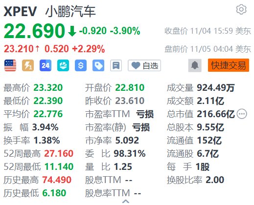| XPEV 小鹏汽车 | | 0 | | --- | --- | --- | | | 22.690 + -0.920 -3.90% | 收盘价 11/04 15:59 美东 | | 23.210 + 0.520 +2.29% | | 盘前价 11/05 04:04 美东 | | | 一 7 24 4 8 8 8 8 0 | ● 快捷交易 | | 最高价 23.320 | 开盘价 22.810 | 成交量 924.49万 | | 最低价 22.390 | 昨收价 23.610 | 成交额 2.11亿 | | 平均价 22.776 | 市盈率ITM 亏损 | 总市值 216.66亿 (…) | | 振 幅 3.94% | 市盈率(静) 亏损 | 总股本 9.55亿 | | 换手率 1.38% | 市净率 5.092 | 流通值 152亿 | | 52周最高 27.160 | 委 比 98.31% | 流通股 6.7亿 | | 52周最低 11.140 | 量 比 1.25 | 每 手 1股 | | 历史最高 74.490 | 股息TIM -- | 换股比率 2.00 | | 历史最低 6.180 | 股息率TM ...