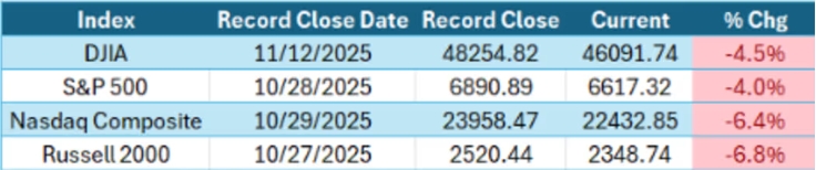 美联储上月将联邦基金利率区间下调25个基点至3.75%—4.0%,并宣布将于12月1日停止缩表。然而,由 于政府停摆导致数据延迟,加上近期公布的经济数据偏强,使投资者质疑12月降息是否仍是"板上钉 钉"。 美国股市周二再度走低,标普500指数与道琼斯工业平均指数双双录得连续第四个交易日下跌,市场情绪 急剧转向风险规避,年末行情面临不确定性考验。 截至收盘,标普500指数下跌0.83%,道指下跌1.07%,创下自8月21日以来最长连跌纪录。科技股压力尤 为突出,以科技股为主的纳斯达克指数当天下跌1.21%,为连续第二日下挫。 过去四天的跌势使道指较上周创下的历史高点回落约4.5%,小盘股标普小型股指数也已超过下跌区间的 一半,逼近技术性回调水平(从高点跌幅达10%)。根据道琼斯市场数据,标普500指数中已有324只成分股 自52周高点回落超过10%,显示抛压广泛,而非集中于单一板块。 | Index | Record Close Date Record Close | | Current | % Chg | | --- | --- | --- | --- | --- | | DJIA | 11/12/2025 ...