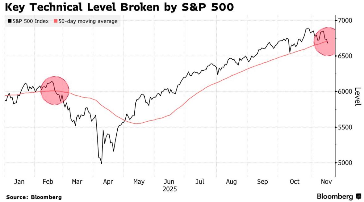 智通财经APP注意到,研究美国股市图表模式的分析师们正在拉响警报,市场担忧最新的下跌可能扩大为至少10%的全面回调。 标普500指数周一的急剧抛售将其自10月28日最近一个纪录高点的跌幅扩大至3.2%,这是自今年2月至4月暴跌以来,该指数从历史高点出现的最严重回撤。 这一基准指数收盘跌破50日移动平均线,为139个交易日以来首次,打破了本世纪维持在该重要趋势线上方的第二长纪录。 该指数也跌穿了6,725点这一关键水平逾50点。高盛集团的Lee Coppersmith在当天早些时候指出,这个水平可能促使趋势跟踪的量化基金(CTA)从买家转变为 卖家。 Janney Montgomery Scott的技术策略师兼研究副总监Dan Wantrobski认为,标普500指数跌破其50日移动平均线的历史连胜纪录,可能预示着更多波动即将到 来。 Wantrobski表示:"股市回调已经发生,我认为标普500指数将从此进一步下跌。"他补充说,到12月下旬,标普500指数的回撤幅度可能达到5%至10%。"市场 广度非常糟糕。股市处于脆弱位置。标普500指数现在经历温和回调会更好,否则明年初情况会更严重。" 美国股市的多头可能 ...