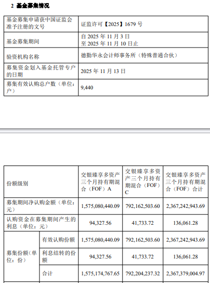 | 基金募集申请获中国证监会 | 证监许可【2025】1679号 | | --- | --- | | 准予注册的文号 | | | 基金募集期间 | 自 2025年11月3日 至 2025年11月10日止 | | 验资机构名称 | 德勒华永会计师事务所(特殊普通合伙) | | 募集资金划入基金托管专户 | 2025年11月13日 | | 的日期 | | | 募集有效认购总户数(单位: | 9.440 | | 户) | | | 份额级别 | | 交银臻享多资产 三个月持有期混 | 交银镂享多份 产三个月持有 期混合(FOF) | 交银臻享多资产 三个月持有期混 | | --- | --- | --- | --- | --- | | | | 솜 (FOF) A | C | 合(FOF) 合计 | | 募集期间净认购金额(单位: 元) | | 1.575.080.440.09 | 792.162.503.60 | 2.367.242.943.69 | | 利息(单位:元) | 认购资金在募集期间产生的 | 94.327.56 | 41.733.72 | 136,061.28 | | 有效认购份额 | | 1.575. ...