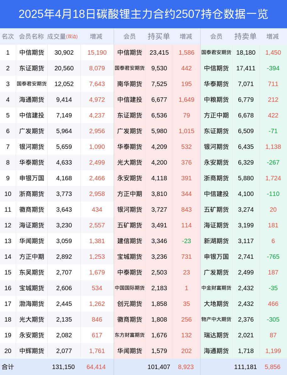 文章来源:新浪期货 2025年4月18日碳酸锂主力合约2507持仓数据一览 | | 名次 会员名称 成交量(双边) | | 壇減 | 会员 | 持买单 | 增减 | 会员 | 持卖单 | 增减 | | --- | --- | --- | --- | --- | --- | --- | --- | --- | --- | | ਹ | 中信期货 | 30,902 | 15,190 | 中信期货 | 23,415 | 1,586 | 国泰君安期货 18,180 | | 1,450 | | 2 | 东证期货 | 20,560 | 8,079 | 国泰君安期货 | 9,530 | 442 | 中信期货 | 17,411 | -394 | | 3 | 国泰君安期货 | 12,052 | 7,643 | 車生期货 | 7,525 | 195 | を素期货 | 7,071 | 711 | | 4 | 海通期货 | 9,414 | 4,972 | 中信建投 | 6,677 | 1,649 | 中粮期货 | 6,779 | 212 | | 5 | 中信建投 | 7,149 | 4,237 | 东证期货 | 6,536 | 79 ...