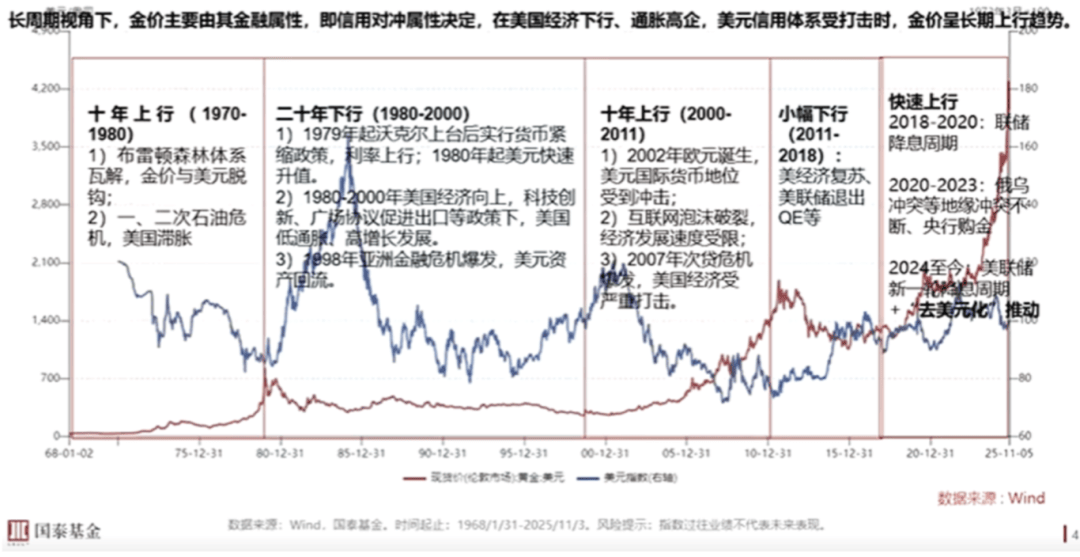 我们觉得黄金是"未完待续"。但是我觉得明年大家也不要期待黄金涨得会比今年还要高。这个可能是比较现实的。 我们可以看一下黄金过往的走势,有一张图是从1968年到2025年,可以非常明显的看到金价跟美元的走势是一个反向关系。当然中间偶尔有一两年它可能 也是成正向的关系,但是大体上来说还是成反向的关系。这两年黄金虽然和美元依然是一个反向关系,但是有个很有意思的现象,就是美元并没有出现大 幅下跌的情况下,黄金上涨的斜率非常高。所以,这里边一定发生了一些和以前不一样的地方。 我们认为这背后应该是"去美元化"在推动,"去美元化"执行的最显著的是谁?就是各国的央妈。比如我们中国的央行也在继续增持,尤其是23年开始,各 国央行累计的黄金储备开始比22年有一个相对比较显著的上涨。24年比23年有显著的上涨,25年又比24年有更显著的上涨。所以这几年各国央行在增持黄 金这件事情上,都还蛮一致的。到9月底的时候,根据官方披露的数据,我们的黄金储备是7402万盎司,美元计价的话是2972.09亿美元,目前我国的外汇 储备是3.3万亿美元,可以看出,黄金的占比还不到10%,四舍五入就按10%算。所以我们央妈对黄金的资产配置在它的外储占 ...