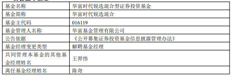 华富时代锐选混合A/C成立于2022年12月1日,截至2025年10月31日,其今年来收益率为22.76%、 22.38%,成立来收益率为-0.82%、-1.96%,累计净值为0.9918元、0.9804元。 | 基金名称 | 华富时代锐选混合型证券投资基金 | | --- | --- | | 基金简称 | 华富时代锐选混合 | | 基金主代码 | 016119 | | 基金管理人名称 | 华富基金管理有限公司 | | 公告依据 | 《公开募集证券投资基金信息披露管理办法》 | | 基金经理变更类型 | 解聘基金经理 | | 共同管理本基金的其他基 金经理姓名 | 王界伟 | | 离任基金经理姓名 | 陈奇 | 王羿伟2012年3月进入华富基金管理有限公司,曾任助理金融工程研究员、基金经理助理兼金融工程研 究员。 中国经济网北京11月3日讯近日,华富基金公告,陈奇离任华富时代锐选混合,王羿伟管理。 ...