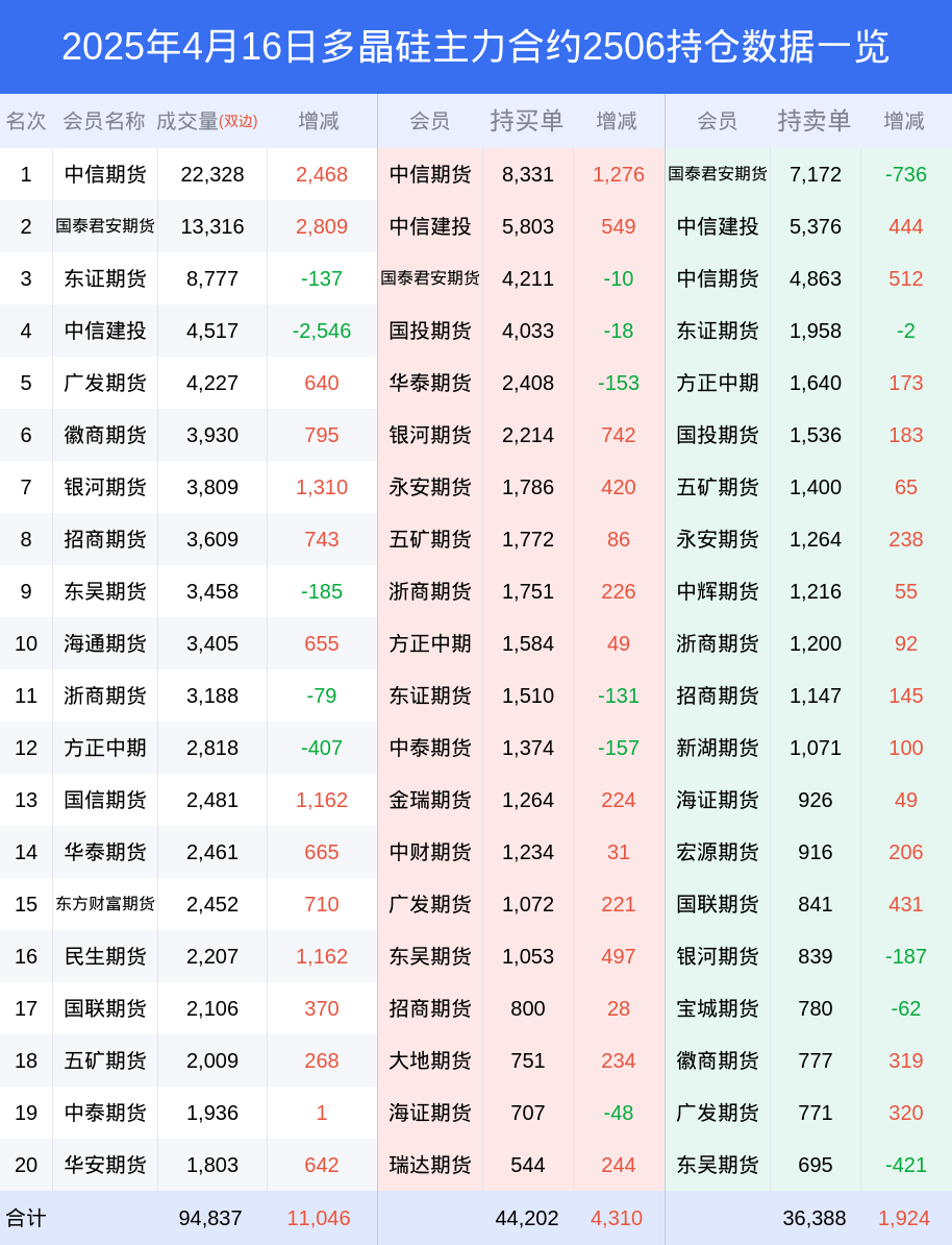 新浪期货 根据交易所数据,截至4月16日收盘主力合约多晶硅2506,涨跌-1.06%,成交量7.41万手,持仓数据显示前20席位呈现净 多,差额头寸为7814手。 多晶硅期货全合约总计成交8.77万手,比上一日新增1.12万手。全合约前20席位多头持仓4.42万手,比上一日增加4310手。全合约 前20席位空头持仓3.64万手,比上一日增加1924手。 根据合并数据显示,多头前三席位为中信期货(代客),总持仓8331、中信建投(代客),总持仓5803、国泰君安期货(代 客),总持仓4211;空头前三席位为国泰君安期货(代客),总持仓7172、中信建投(代客),总持仓5376、中信期货(代 客),总持仓4863; 主力合约前20席位中,多头增仓前三名分别是:中信期货(代客)、持仓8331、增仓1276,银河期货(代客)、持仓2214、增仓 742,中信建投(代客)、持仓5803、增仓549;多头减仓前三名分别是:中泰期货(代客)、持仓1374、减仓-157,华泰期货 (代客)、持仓2408、减仓-153,东证期货(代客)、持仓1510、减仓-131; 主力合约前20席位中,空头增仓前三名分别是:中信期货(代客) ...
