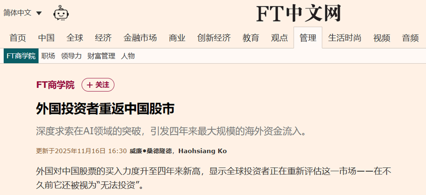 《金融时报》近日发文称,根据全球银行业的行业组织国际金融协会(Institute of International Finance)的数据,今年1月 至10月流入中国股票的离岸资金总计506亿美元,高于2024年的114亿美元。 【环球网财经综合报道】Wind最新数据显示,2025年以来,中国ETF市场年度发行数量首次突破300只整数关口,达 到320只,新成立ETF基金发行规模达2496.77亿元。 与此同时,外国对中国股票的买入力度升至四年来新高,显示全球投资者正在重新评估A股资产。 报道还提到,今年,在内地和香港上市的中资股票大幅走高,主要是受深度求索(DeepSeek)发布突破性模型后激发的 人工智能热潮,以及亚洲金融中心强劲的上市潮所推动。 ...