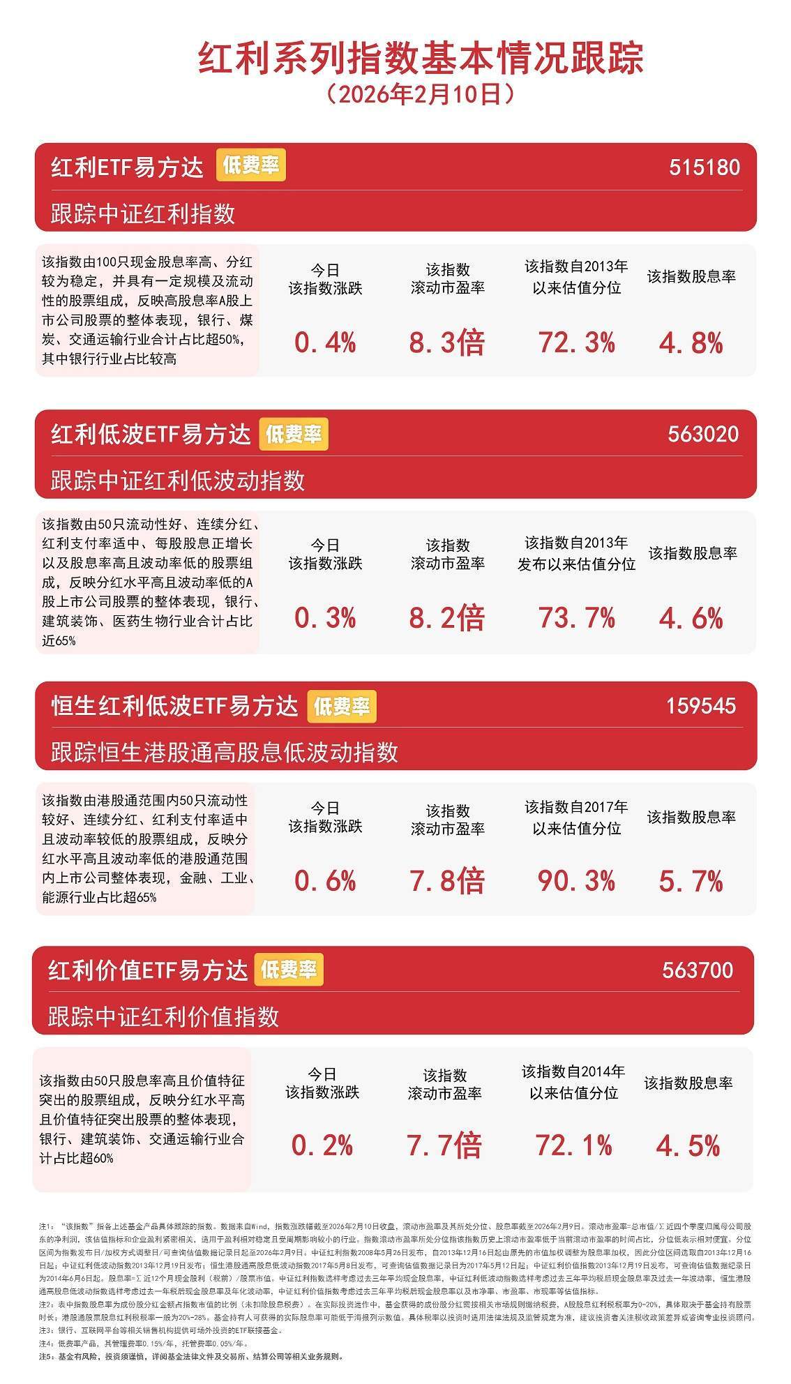 Group 1 - The Hang Seng High Dividend Low Volatility Index rose by 0.6%, while the CSI Dividend Index increased by 0.4%, achieving a "three consecutive days of gains" [1] - The E Fund Hang Seng High Dividend Low Volatility ETF (159545) saw a net subscription exceeding 10 million units today [1] - E Fund's dividend ETFs, including the Hang Seng High Dividend Low Volatility ETF and the Dividend ETF, received net inflows of 190 million yuan and 490 million yuan respectively over the past week [1] Group 2 - E Fund is currently the only fund company that implements low fee rates for all its dividend ETFs, with a management fee rate of 0.15% per year for its products [1] - The CSI Dividend Index consists of 100 stocks with high cash dividend yields and stable dividends, with over 50% of its composition from the banking, coal, and transportation sectors [3] - The CSI Low Volatility Dividend ETF tracks stocks with good liquidity, continuous dividends, and low volatility, with nearly 65% of its composition from the banking, construction decoration, and pharmaceutical sectors [3]