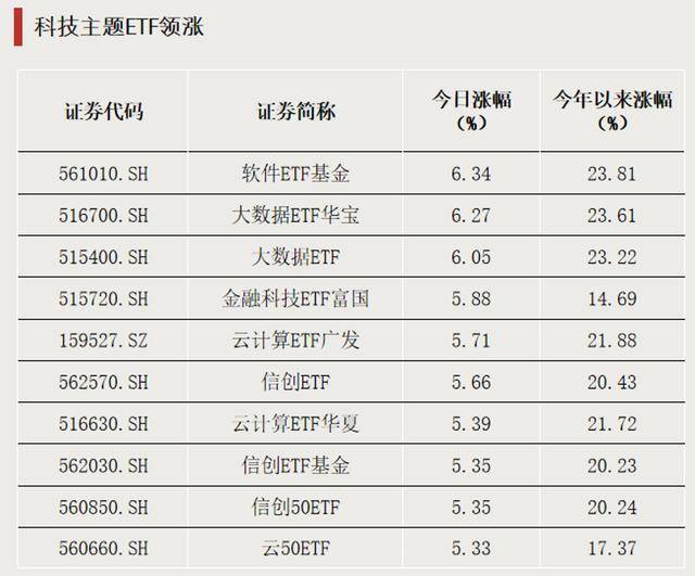 Group 1: ETF Market Overview - On January 14, the overall ETF market saw more funds rising than falling, with over half of the funds closing higher, particularly in technology sectors such as software, big data, fintech, and cloud computing, where several products rose over 5% [1][4] - The total scale of cross-border ETF products has surpassed 1 trillion yuan, with the number of products reaching 207. More than 30% of cross-border ETFs are trading at a premium, with the highest premium rate for the Nasdaq Technology ETF at 19.36% [2][15] - The ETF market experienced a net inflow of approximately 5.66 billion yuan, an increase from 1.157 billion yuan on January 12, with stock ETFs being the main attraction for capital [3][8] Group 2: Performance of Technology ETFs - Technology sector ETFs performed exceptionally well on January 14, with all top ten gainers being technology-related products, each rising over 5%. Several technology ETFs have seen gains exceeding 20% in the first eight trading days of the year [4][5] - The Software ETF (561010) topped the gainers list with a rise of 6.34% and a premium rate of 2.19%. It tracks the CSI Software Development Index, which includes 117 constituent stocks, with 10 stocks rising over 10% [4][5] - Two ETFs tracking the CSI Big Data Industry Index also saw gains exceeding 6%, with notable performances from Tianyuan Dike and Yidian Tianxia, which rose 18.61% and over 16%, respectively [4] Group 3: Decline in Other Sectors - Several ETFs in the electric grid and banking sectors saw significant declines on January 14, with the Electric Grid ETF (561380) dropping 5.81%, marking the largest decline of the day [6][7] - The banking sector ETFs also experienced widespread declines, with three ETFs falling more than 1.6%, reflecting a broader downturn in the sector [6][7] Group 4: Fund Flow Dynamics - The inflow of funds into stock ETFs showed a clear divergence, with many industry ETFs attracting significant capital while some broad-based index ETFs faced net outflows [8][9] - The Media ETF (512980) alone attracted over 4 billion yuan in net inflows in just one trading day, indicating strong investor interest in specific sectors [8][9] Group 5: Cross-Border ETF Insights - The cross-border ETF market is expanding, with a significant portion of new products targeting the Hong Kong stock market. The premium rates for many cross-border ETFs indicate strong demand [15] - The Nasdaq Technology ETF has issued a premium risk warning and will suspend trading for one hour if the premium does not decrease, highlighting the volatility and investor caution in this segment [15]