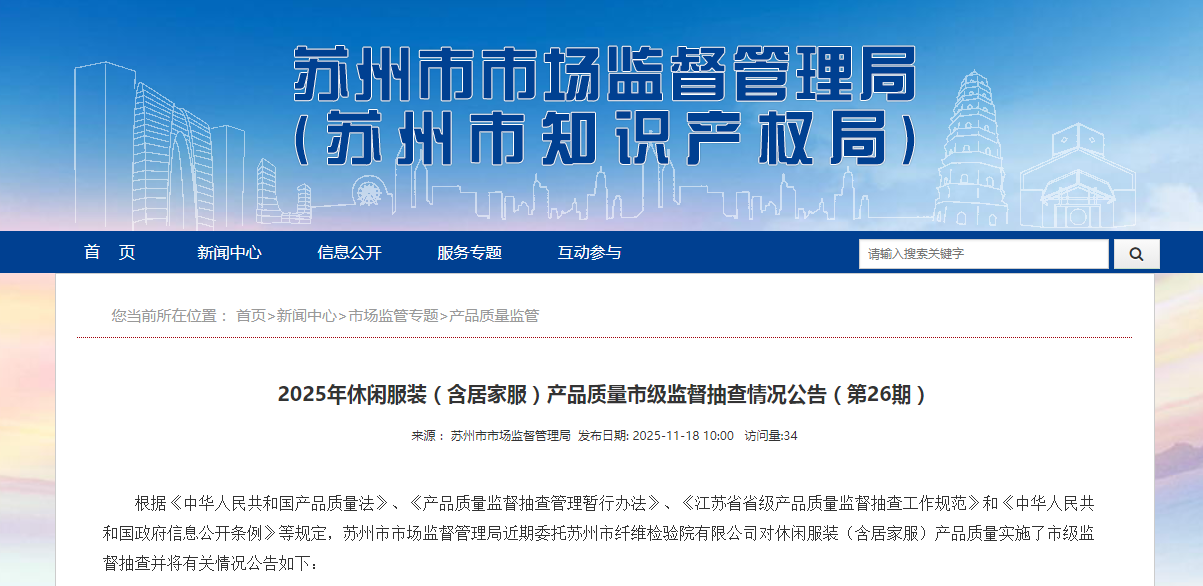 江苏省苏州市市场监管局公布2025年休闲服装(含居家服)产品质量市级监督抽查情况公告(第26期)