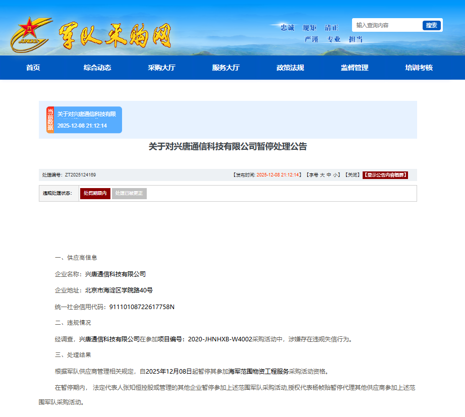 近日,军队采购网发布关于对兴唐通信科技有限公司暂停处理公告。 经调查,兴唐通信科技有限公司在参加项目编号:2020-JHNHXB-W4002采购活动中,涉嫌存在违规失信行为。 关于对兴唐通信科技有限 2025-12-08 21:12:14 关于对兴唐通信科技有限公司暂停处理公告概要 处理编号: ZT2025124169 【发布时间: 2025-12-08 21:12:14】【字号 大 中 小】【关闭】【显示公告内容额度】 违规处理状态: 处罚期限内 处理已被更正 被处理供应商信息 供应商名称: 兴唐通信科技有限公司 统一社会信用代码: 91110108722617758N 企业地址: 北京市海淀区学院路40号 被处理人员信息 姓名 身份证号码 人员类型 杨帧始 430***********56X 授权代表 370***********012 张知恒 法定代表人 违规处理信息 暂停事由: 处理结果: 根据军队供应商管理相关规定,自2025年12月08日起暂停其参加海军范围物资工程服务采购活动资格, 暂停生效范围 (单位) : 海 暂停时间: 2025-12-08 自行采购 组织形式: 海后采购和资产管理局 处理 ...