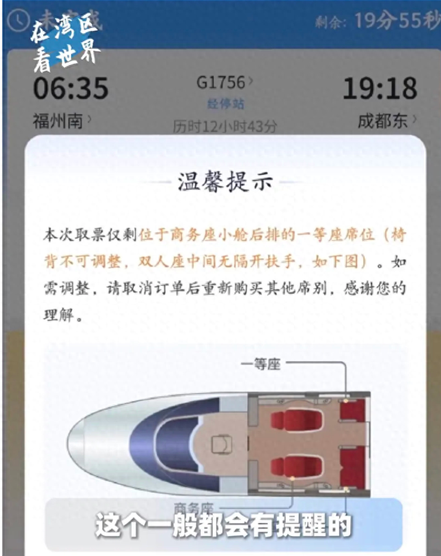 此外,实际坐感也很不好,不仅中间没有扶手,靠背也无法调节。于是不少网友将这些座位戏称为"低人一等座"。 近日,有网友在社交媒体发帖称,自己在购买高铁票时,12306App弹出一则温馨提示:本次取票仅剩位于商务座小舱后排的一等座位(椅背不可调整, 双人座中间无隔开扶手)。如需调整,请取消订单后重新购买其他席别。 不少网友留言称:这是不是就是传说中的"低人一等座"?现在都有提醒了吗? 2月12日,12306客服表示,因为有部分一等座座位是位于商务座舱后的,该位置比较特殊,所以增加了提醒。若旅客看到提示,并介意购买此位置,可以 取消订单后重新购买。 此前,有关"低人一等座"的讨论,曾冲上微博热搜。 2025年,多位网友在社交平台发文称,购买了高铁一等座车票后发现座位被安排到了商务舱车厢内,本来以为捡到便宜,结果发现座椅和商务舱内的其他 座椅明显不同,有些尴尬。 2025年8月,12306客服人员表示,出现这一情况是由于部分列车编组时会有"混座"情况,即商务座与一等座混合在同一车厢内。客服人员解释,部分列车 在编组时可能额定不能设置这么多商务座,所以就出现了"混编"情况。 对于这一说法,有媒体曾评论称:若无法避免"混 ...