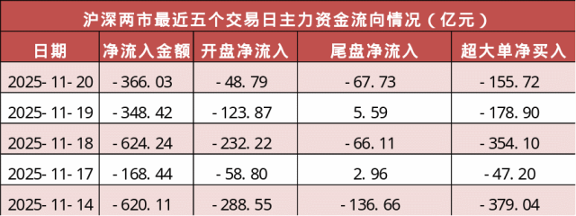 盘后数据出炉。 沪深300今日主力资金净流出57.07亿元,创业板净流出167.5亿元。 | | | 各板块最近五个交易日主力资金净流入数据(亿元) | | | --- | --- | --- | --- | | 日期 | 沪深300 | 创业板 | 科创板 | | 2025- 11- 20 | - 57. 07 | - 167. 50 | - 19. 40 | | 2025- 11- 19 | - 45. 69 | - 118. 03 | - 15. 72 | | 2025- 11- 18 | - 151. 35 | - 217. 99 | - 3. 77 | | 2025- 11- 17 | - 83. 50 | - 75. 05 | - 12. 50 | | 2025- 11- 14 | - 204. 39 | - 257. 80 | - 17. 13 | | | | 尾盘资金净流入数据(亿元) | | | 2025- 11- 20 | - 17. 67 | - 26. 53 | - 5. 22 | | 2025- 11- 19 | 6. 06 | - 3. 06 | 1.16 | | 2025- 11 ...