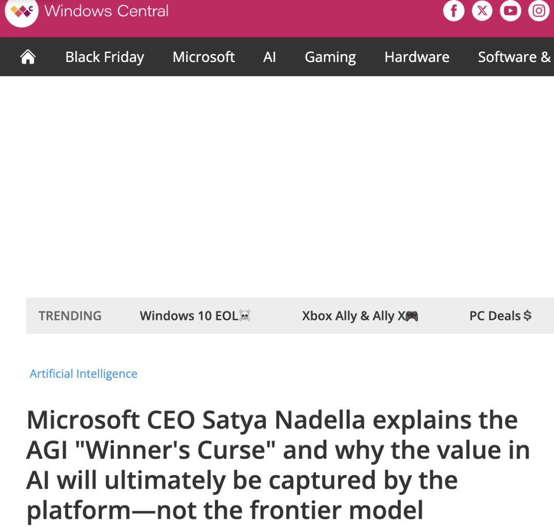 Core Insights - Microsoft CEO Satya Nadella expressed unique insights on Artificial General Intelligence (AGI) during a recent interview, emphasizing the need for a diverse ecosystem of models rather than relying on a single model to address all challenges [1][3] - Nadella warned that if a single AGI model achieves overwhelming dominance and is fully deployed, it could lead to the end of competition and market stagnation [3] Group 1: AGI Perspectives - Nadella is excited about the potential of AGI to drive exponential growth through increased productivity [3] - He advocates for a multi-model approach, highlighting the importance of building an ecosystem that includes various models, scenarios, and scales [3] Group 2: Business Implications - The collaboration between "model companies" that provide algorithmic foundations and "architecture-driven companies" that transform these models into sustainable business services is crucial [3] - Without this collaboration, the risk of a "winner's curse" looms, where leading companies incur high R&D costs only to see their innovations quickly commoditized, resulting in profits being captured by downstream ecosystems [3]