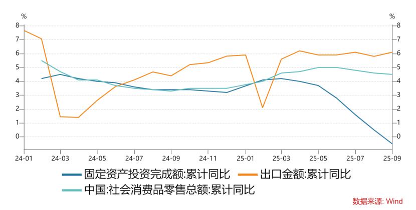 2025年即将收尾,也是"十四五"规划的收官之年。今年前三季度中国经济增长5.2%,预计能完成全年5%左右的经济增 长目标。 尽管看起来经济增长有条不紊、波澜不惊,但在科技主题的宏观叙事下以及中美贸易摩擦的背景下,中国的经济结构 和政策环境发生了显著变化,房地产开发投资占GDP比重继续下滑至6.7%,比去年下降0.7个百分点,比2020年下降7 个百分点,体现了这五年经济对地产的依赖明显下降;另一方面,制造业投资保持一定增速,特别是以光伏、新能源 和电子为代表的新兴行业投资和出口保持较快增速。 这在资本市场上也形成了映射,体现为:今年A股估值修复以及科技板块领涨,而传统消费、煤炭和石化能源板块表 现一般。 从前三季度"三驾马车"对经济的贡献看,今年消费、资本形成总额和净出口分别贡献53.5%、17.5%和29.0%。 消费对经济的贡献超过一半,贡献率比去年多出9个百分点,消费包括居民消费和政府消费,其中代表居民消费的社 会消费品零售总额同比增长4.5%,比去年高出1个百分点;政府支出方面,一般公共预算支出增长3.1%,基金预算支 出增长23.9%,增速较高。 资本形成总额主要包括固定资产投资和存货变动,今年固 ...