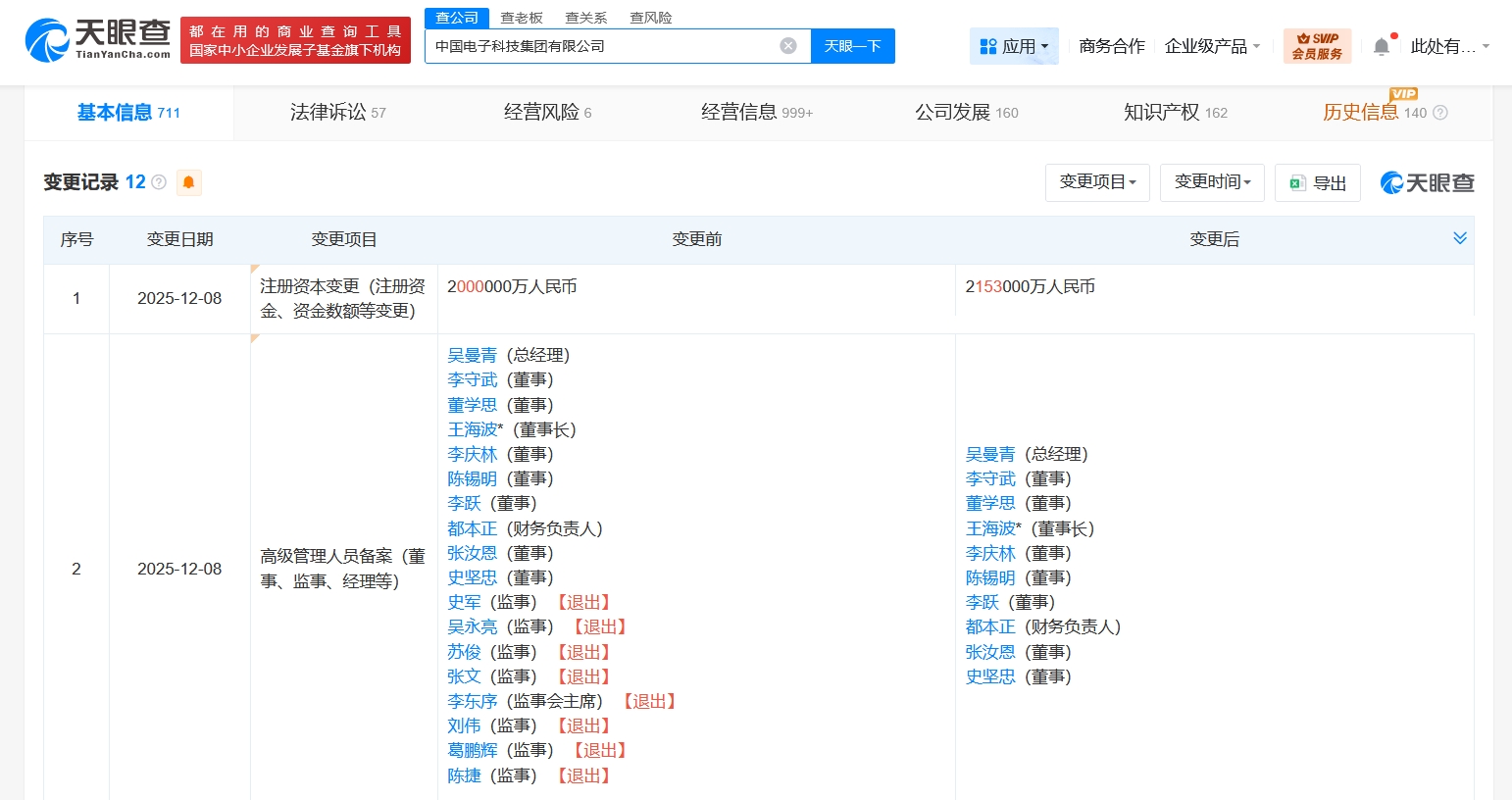 每经AI快讯,天眼查App显示,近日,中国电子科技集团有限公司发生工商变更,注册资本由200亿元人民币增至215.3亿元,增幅约7.7%,同时,多位主要 人员发生变更。该公司成立于2002年2月,法定代表人为王海波,经营范围含承担国家重大电子信息系统工程建设,民用电子信息软件、材料、元器件、整 机和系统集成及相关共性技术的科研、开发、生产、销售等。股东信息显示,该公司由国务院国有资产监督管理委员会全资持股。 | 元天眼查 都在用的商业直通工具 | 查公司 查老板 查关系 查风险 | | | | --- | --- | --- | --- | | 国家中小企业发展子基金旗下机构 TianYanCha.com | 中国电子科技集团有限公司 | (×) 天眼一下 | 脂 应用 ▼ | | 序号 | 变更日期 | 变更项目 | 变更前 | | | --- | --- | --- | --- | --- | | 1 | 2025-12-08 | 注册资本变更(注册资 | 2000000万人民币 | 2153000万人民 | | | | 金、资金数额等变更) | | | | | | | 吴曼青 (总经理) | | | | ...