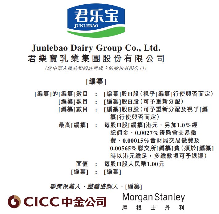 | [編纂]的[編纂]數目 | : [編纂]股H股(視乎[編纂]行使與否而定) | | --- | --- | | [編纂]數目 : | [編纂]股H股(可予重新分配) | | [編纂]數目 | : [編纂]股H股(可予重新分配及視乎[編 | | | 纂]行使與否而定) | | 最高[編纂] : | 每股H股[編纂]港元,另加1.0%經 | | | 紀佣金、0.0027%證監會交易徵 | | | 費、0.00015%會財局交易徵費及 | | | 0.00565%聯交所[編纂]費(須於[編纂] | | | 時以港元繳足,多繳款項可予退還) | | 簡值 : | 每股H股人民幣1.00元 | | [編纂] : [編纂] | | 智通财经APP获悉,据港交所1月19日披露,君乐宝乳业集团股份有限公司(简称:君乐宝)向港交所主板 递交上市申请书,中金公司、摩根士丹利为其联席保荐人。招股书显示,君乐宝是创新驱动、中国领先 的综合性乳制品公司。历经30年深耕,公司已成长为产品品类多元化、产业链一体化运营的全国性乳制 品公司。根据弗若斯特沙利文报告,以2024年中国市场零售额计,公司的"君乐宝"品牌已成为中国最具 知名度的 ...