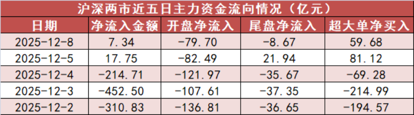 盘后数据出炉。 12月8日,A股市场整体上涨。截至收盘,上证指数报3924.08点,上涨0.54%;深证成指报13329.99点,上涨1.39%;创业板指 报3190.27点,上涨2.6%;北证50指数上涨1.27%。A股市场合计成交20517.44亿元,较上一交易日增加3126.79亿元。 1.A股市场主力资金净流入7.34亿元 今日A股市场主力资金开盘净流出79.7亿元,尾盘净流出8.67亿元,A股市场全天主力资金净流入7.34亿元。 | | | 沪深两市近五日主力资金流向情况(亿元) | | | | --- | --- | --- | --- | --- | | 日期 | | | 净流入金额 开盘净流入 尾盘净流入 超大单净买入 | | | 2025-12-8 | 7. 34 | -79.70 | -8. 67 | 59. 68 | | 2025-12-5 | 17.75 | -82. 49 | 21.94 | 81. 12 | | 2025-12-4 | -214.71 | -121.97 | -35. 67 | -69.28 | | 2025-12-3 | -452. 50 | -107. 61 | ...