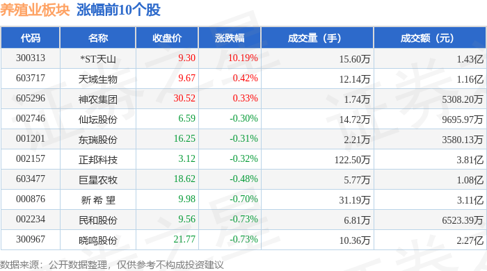 证券之星消息,11月12日养殖业板块较上一交易日下跌0.83%,华英农业领跌。当日上证指数报收于 4000.14,下跌0.07%。深证成指报收于13240.62,下跌0.36%。养殖业板块个股涨跌见下表: | 代码 | 名称 | 收盘价 | 涨跌幅 | 成交量(手) | 成交额(元) | | | --- | --- | --- | --- | --- | --- | --- | | 300313 | *ST天山 | 9.30 | 10.19% | 15.60万 | | 1.43亿 | | 603717 | 天域生物 | 9.67 | 0.42% | 12.14万 | | 1.16亿 | | 605296 | 神农集团 | 30.52 | 0.33% | 1.74万 | | 5308.20万 | | 002746 | 仙坛股份 | 6.59 | -0.30% | 14.72万 | | 9695.97万 | | 001201 | 东瑞股份 | 16.25 | -0.31% | 2.21万 | | 3580.13万 | | 002157 | 正邦科技 | 3.12 | -0.32% | 122.50万 | | 3. ...