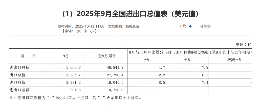 超预期:中国9月以美元计价出口同比增长8.3%,进口同比增7.4%