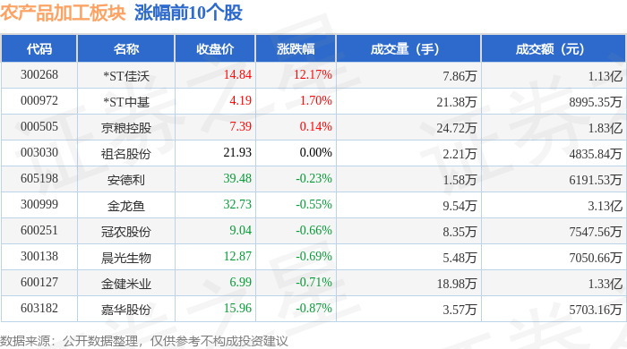 证券之星消息,11月18日农产品加工板块较上一交易日下跌0.93%,保龄宝领跌。当日上证指数报收于 3939.81,下跌0.81%。深证成指报收于13080.49,下跌0.92%。农产品加工板块个股涨跌见下表: | 代码 | 名称 | 收盘价 | 涨跌幅 | 成交量(手) | 成交额(元) | | | --- | --- | --- | --- | --- | --- | --- | | 300268 | *ST佳沃 | 14.84 | 12.17% | 7.86万 | | 1.13亿 | | 000972 | *ST中基 | 4.19 | 1.70% | 21.38万 | | 8995.35万 | | 000505 | 京根控股 | 7.39 | 0.14% | 24.72万 | | 1.83亿 | | 003030 | 祖名股份 | 21.93 | 0.00% | 2.21万 | | 4835.84万 | | 605198 | 安德利 | 39.48 | -0.23% | 1.58万 | | 6191.53万 | | 300999 | 金龙鱼 | 32.73 | -0.55% | 9.54万 | | 3. ...