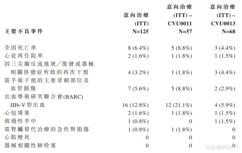 安全性结果显示: 经临床事件委员会(CEC)裁定,术后30天内主要不良事件(MAE)发生率如下: 智通财经APP讯,启明医疗-B(02500)发布公告,本公司的创新经导管瓣膜置换系统Cardiovalve的TARGET研究 (TARGET研究)中期临床结果。TARGET研究为一项前瞻性、单组、多中心临床研究,旨在评估Cardiovalve经导 管瓣膜置换系统的安全性及临床表现。TARGET研究的中期临床试验数据包括在德国、西班牙、意大利、加拿大 和英国的25个临床中心的125例患者,患者平均年龄为77岁。 TARGET研究临床结果显示:(1)器械平均手术时间为58±29分钟,最短器械手术时间仅为16分钟;及(2)依据三尖 瓣学术联盟(TVARC)标准,总体术中成功率为88%。器械植入组成功率高达95%。 有效性结果显示: (1)对于三尖瓣反流程度的改善情况,术后6个月随访显示,100%患者未出现中度以上反流,且该疗效在12个月随 访期间保持稳定; (2)根据纽约心脏协会标准,在心功能改善情况方面,术后6个月时88%患者心功能恢复至I/II级,12个月时该比例 提升至90%。6个月随访期间未观察到纽约心脏协会I ...