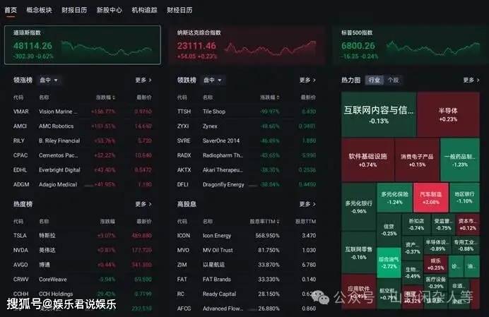 一、宏观迷雾:为什么"坏数据"成了"救命稻草"? | 首页 | 昼念板块 财报日历 | 新股中心 | 机构造综 | 财经日历 | | | | | | | | | | --- | --- | --- | --- | --- | --- | --- | --- | --- | --- | --- | --- | --- | | 道琼斯指数 | | | | 纳斯达克综合指数 | | | | 标准500指数 | | | | | | 48114.26 | | | | 23111:46 | | | | 6800.26 | | | | | | 305 30 -D 03 | | | | *24.02 +0.23 | | | | 16:25 -0 24 | | | | | | 领涨榜 | 盘中 ·· | | 更多 > | 领跌榜 | 国中 · | | 更多 > | 热力图 行业 个股 | | | | 更多 > | | 代码 | នធ | 新颜描 : | 履新价 | 代码 | 名称 | 源联盟 : | 量新价 | | | | | | | VMAR | Vision Marine | +156.77% | 0.6760 | TTS ...