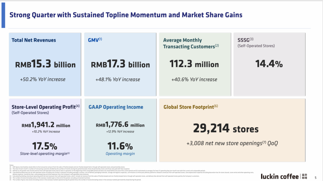 Core Insights - The current strategic focus of the company is on business growth and market share expansion, as highlighted by the strong financial performance in Q3 2025 [2][10] - The company reported a total net revenue of 15.287 billion RMB in Q3 2025, representing a year-on-year growth of 50.2% [2][3] - The company achieved a GAAP operating profit of 1.777 billion RMB with an operating profit margin of 11.6% [2][3] Financial Performance - Total net revenue for Q3 2025 was 15.287 billion RMB, up from 10.181 billion RMB in Q3 2024, marking a 50.2% increase [3] - Same-store sales growth for self-operated stores in Q3 2025 was 14.4% [3] - The average monthly transaction customer count reached over 112 million, a 40.6% increase from 79.85 million in Q3 2024 [3][4] Customer Metrics - The company added over 42 million new transaction customers in Q3 2025, with a cumulative transaction customer count exceeding 420 million [4] - The monthly average transaction customer count surpassed 100 million for the first time, marking a significant milestone [4] Store Expansion - The company maintained a leading store opening pace, with a net increase of 2,979 stores in China, bringing the total to 29,096 stores [6] - The number of self-operated stores reached 18,809, while franchise stores exceeded 10,287 [6] - Internationally, the company added 29 stores, bringing the total to 118, with a focus on Singapore and the U.S. markets [7] Market Strategy - The company is focused on expanding its store network in high-tier cities while also penetrating lower-tier markets [4][6] - The CEO emphasized the importance of product innovation and brand value enhancement to meet diverse customer needs and support long-term growth [4][9] Industry Context - The coffee market in China is still in its early stages, with significant growth potential as consumer demand continues to rise [10] - The company is adapting to market changes, including the impact of reduced subsidies from delivery platforms, while maintaining a focus on long-term development [8][9] - The CEO noted that the coffee business will gradually return to a self-pickup model as the primary consumption method, despite the current reliance on delivery services [9]