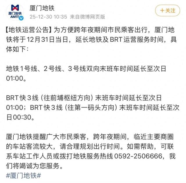 海西晨报2025-12-30 11:05:40 厦门地铁最新发布! 记者从厦门轨道交通集团获悉 地铁1号线、2号线、3号线双向末班车时间延长至次日01:00。 BRT快3线(往前埔枢纽方向)末班车时间延长至次日01:00;BRT快3线(往第一码头方向)末班车时 间延长至次日00:30。 2024年跨年夜,地铁客流如潮。厦门轨道交通集团供图 厦门地铁提醒广大市民乘客 跨年夜期间 临近主要商圈的车站客流较大 请合理规划出行时间 为方便跨年夜期间市民乘客出行 厦门地铁将于12月31日当日 延长地铁及BRT运营服务时间 具体如下: ※ 审核:廖桂金 陈祥旺 ※ 来源:海西晨报记者 柯小娇 通讯员 印崧 封面由厦门轨道交通集团供图 如需帮助 可联系车站工作人员 或拨打地铁服务热线 0592-2506666 我们将竭诚为您服务 ※ 编辑:胡婧 ※ 校对:刘子纯 ...