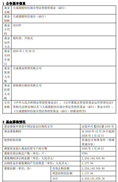 中国经济网北京1月27日讯 今日,大成基金管理有限公司发布关于大成港股恒信混合型证券投资基 金(QDII)基金合同生效公告。 募集期间净认购金额2,254,140,500.80元,认购资金在募集期间产生的利息1,177.56元,募集份额合 计2,254,141,678.36份。 基金经理柏杨曾任摩根士丹利(香港)研究部亚洲与新兴市场策略师。现任大成国际资产管理公司董 事总经理、研究部总监。2017年8月至2018年11月在大成基金管理有限公司国际业务部主持部门工作。 2017年8月起担任大成基金管理有限公司投资经理。2018年11月起担任大成基金管理有限公司国际业务 部总监。 | 基金募集申请获中国证监会注册的文号 | 证监许可【2025】2165号 | | --- | --- | | 基金享集期间 | 自 2025年12月29日起到 | | | 2026年1月22日 | | 验资机构名称 | 容诚会计师事务所(特殊 | | | 書通合伙) | | 募集资金划入基金托管专户的日期 | 2026年1月26日 | | 募集有效认购总户数(单位:户) | 9784 | | 募集期间净认购金額(单位:人民币元) | ...
