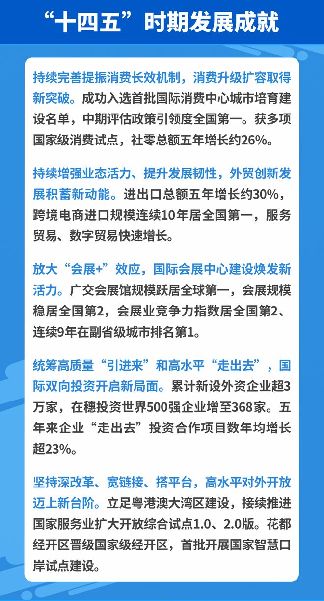 1月16日,广州召开2026年全市商务工作会议。会议全面总结了2025年商务工作情况,部署2026年工作 安排。同时,系统回顾"十四五"时期广州商务发展成绩,明确"十五五"时期商务发展思路。 "十四五"期间,广州多项指标领跑全国,进出口总额五年增长约30%,跨境电商进口规模连续10年居全 国第一,服务贸易、数字贸易快速增长。 "十五五"期间,广州将聚力打造国际消费中心、国际贸易中心、国际会展中心、国际产业链供应链中 心。2026年作为开局之年,广州将全力促消费稳外贸稳外资,确保"十五五"开好局、起好步。 "十四五"成绩单 2025年工作回顾 主中头彻商品网上零售额超 3100亿元 增长 10.2% 全市首家市内免税店落地 离境退税门店增至1620家 离境退税业务量超9.1万份 增长9.3倍 实际外资 251.9亿元 增长9.1% 持续激发消费活力 创新推出"羊城消费新八景"IP 举办国际购物节、精品美食周等 主题活动超 2000场 消费品以旧换新、"广东优品购" 带动销售超 900亿元 惠及居民超 910万人次 荔湾太古里、番禺K11等 一批高端商业载体落地 新增两条省级特色商圈(步行街) 引入高能级首店近4 ...