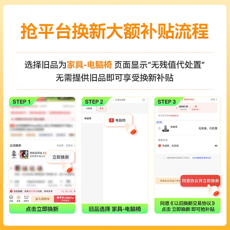 ZANHEE X 電筒H 抢平台换新大额补贴流程 选择旧品为家具-电脑椅 页面显示"无残值代处置" 无需提供旧品即可享受换新补贴 0 STEP 1 同意协议并立即换新 同意《以旧换新交易协议》 旧品选择 家具-电脑椅 点击 立即换新 即可抢补贴 点击: 7 利润新 (0) STEP 1 7 即 渔 安 同意协议并立即换新 同意《以旧换新交易协议》 旧品选择 家具-电脑椅 点高v 即换新 点击 立即换新 即可抢补贴 抢平台换新大额补贴流程 选择旧品为家具-电脑椅 页面显示"无残值代处置" 无需提供旧品即可享受换新补贴 ...