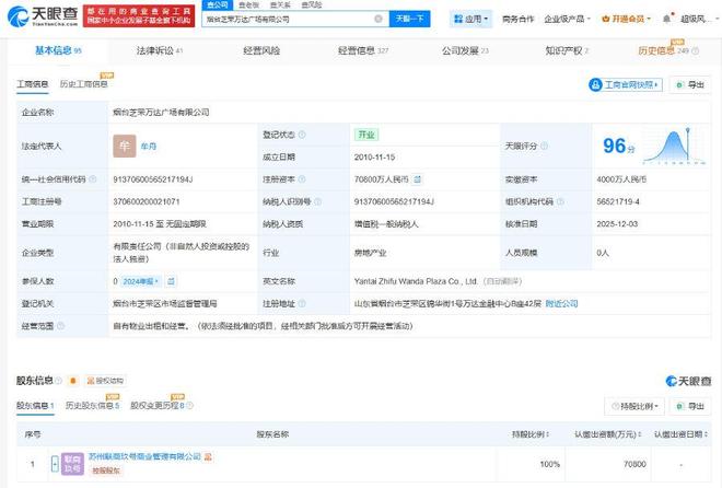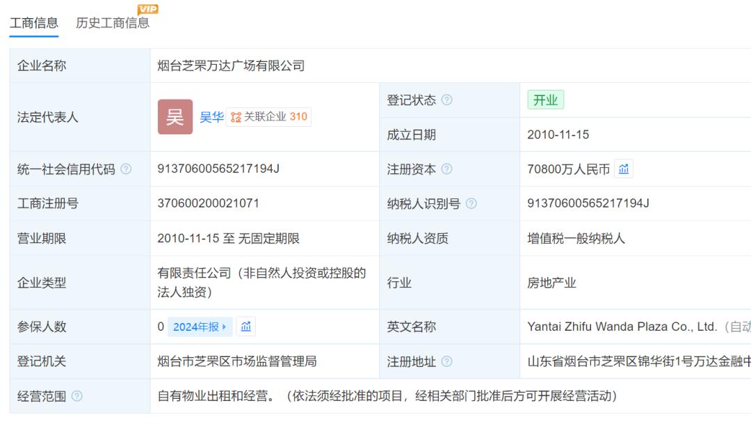 近年一直"卖货"的万达集团,最近竟然罕见的"买货"了。 12月2日,据爱企查显示,烟台芝罘万达广场有限公司发生工商变更,新华保险旗下坤华(天津)股权投资合伙企业(有限合伙)(以下简称"坤华投 资")、坤元辰兴(厦门)投资管理咨询有限公司退出股东行列,大连万达商管旗下上海万达锐驰企业管理有限公司成为新的全资股东,吴华成为新的法 定代表人。 | 企业名称 | 烟台芝罘万达广场有限公司 | | | | --- | --- | --- | --- | | 法定代表人 | 吴华 窟关联企业 310 吴 | 登记状态 2 | 开业 | | | | 成立日期 | 2010-11-15 | | 统一社会信用代码 2 | 91370600565217194J | 注册资本 7 | 70800万人民币 剑 | | 工商注册号 | 370600200021071 | 纳税人识别号 2 | 91370600565217194J | | 营业期限 | 2010-11-15 至 无固定期限 | 纳税人资质 | 增值税一般纳税人 | | 企业类型 | 有限责任公司(非自然人投资或控股的 法人独资) | 行业 | 房地产业 | | 参保人数 ...